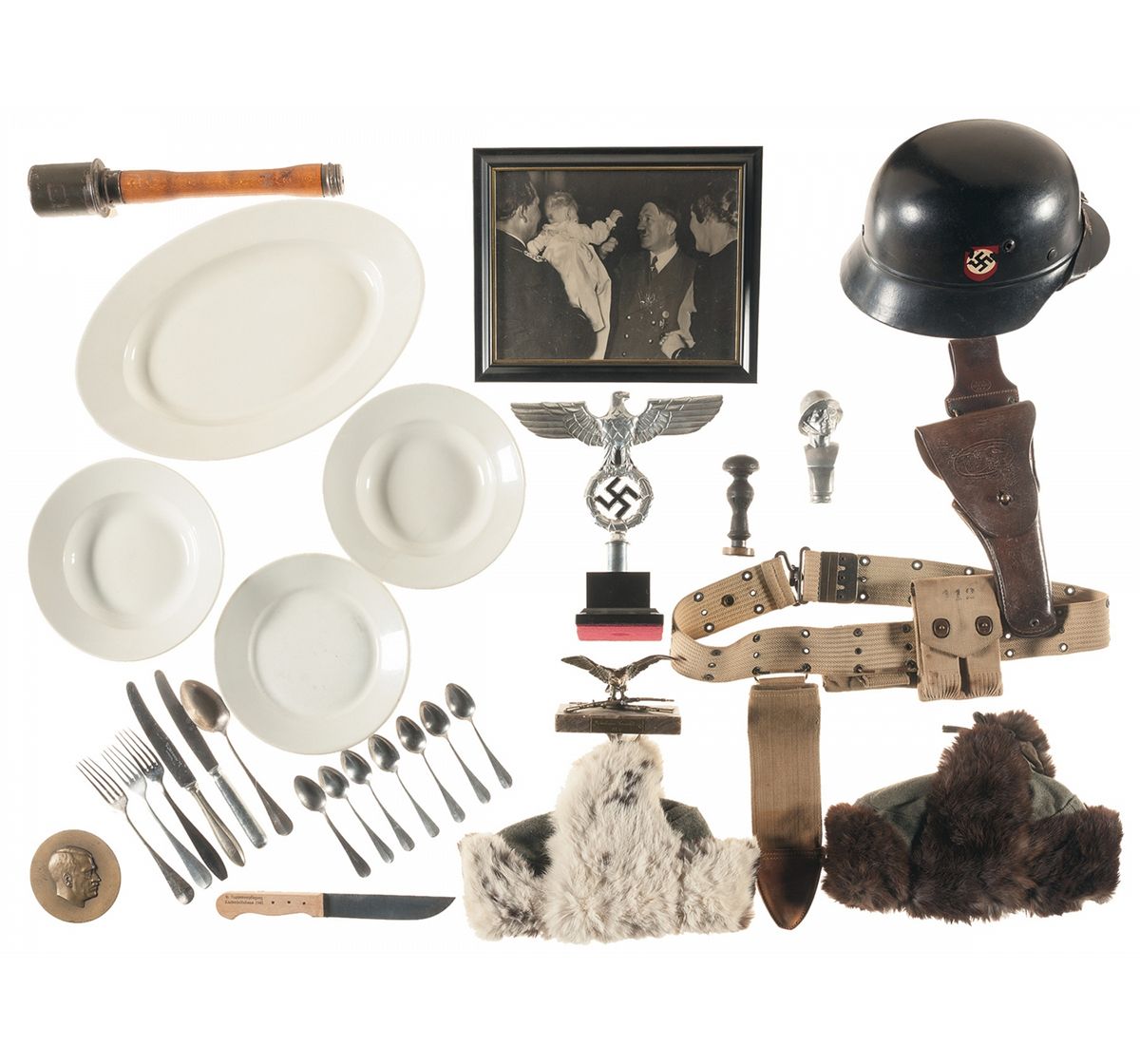 1) Nazi flag topper converted to a desk display, 10 3/4" tall with base. 2) Thirteen pieces of metal tableware, including items with SS runes and Nazi proofs. 3) mess knife, 11" long, 6" blade and wood grip with 1945 dated SS themed markings. 4) 1plate, 2 bowls, and 1 serving tray, with Nazi markings, dated circa 1937-1942. Tray is Luftwaffe marked, and one bowl is "SS-Reich" marked. 5) Framed photograph, 12 3/4" x 10 1/4", of Hitler interacting with an infant. 6) Holler K98 bayonet, 15 1/4" long, 10" blade, metal scabbard, leather frog. 7) Inert Stielhandgranate, marked "bdp. 1943". 8) Desk plaque of Hitler, initialed "IWF.", 4 1/4" wide. 9) Two winter hats, green felt construction with white and brown fur trim. 10) Nazi police helmet, black paint finish, ink marked "57" on the webbing. 11) 1937 dated shooting trophy, 3" tall, marble base. 12) "BOYT/45" 1911 1911 holster, with 1922 dated belt hanger. 13) Scimitar, 28 5/8" long, 23" blade, Spanish markings. 14) Luftwaffe stamp for the VII Glider Division, #165. 15) "SOLINGEN/STAHL" marked K98 bayonet, 14 3/4" long, 10" blade. 16) Alloy soldier bust. 5" tall, no base. 17) Tan canvas Mills web belt, with 1911 magazine pouch, 2 magazines, empty first aid pouch, and partial bolo sheath. 18) Bayonet, 14 3/4" long, 9 7/8" blade marked "P.R.8./5037", leather scabbard. 19) Argentine 1891 bayonet, 20 5/8" long, 15 3/4" blade, ground crest, metal scabbard. 20) Argentine bayonet, 20 1/2" long, 15 3/4" blade, ground crest, metal sheath. 21) Bayonet, 15" long, 10" blade marked "P.R.8/2271", leather scabbard. 22) St. Etienne bayonet, 27 1/2" long, 22 3/4" blade dated "1870", metal sheath. 23) Brazilian "ROMO BR. 900" knife, 11 3/8" long, 6 1/2" sawback blade, plastic grip. Leather scabbard. Lot is fair or better overall.