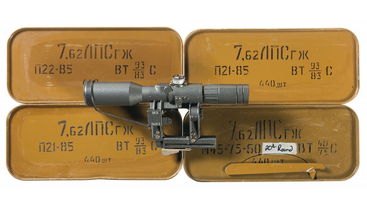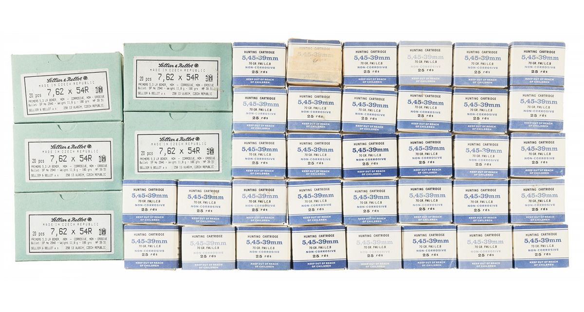 Approximately 1,860 rounds of 7.62x54R and 875 rounds of 5.45x39. This lot consists of (4) 440 round spam cans of 7.62x54R, (5) boxes of Sellier & Bellot 7.62x54R and (34) 25 round boxes of Ulyanovsk 5.45x39 ammunition along with a PSL scope.
