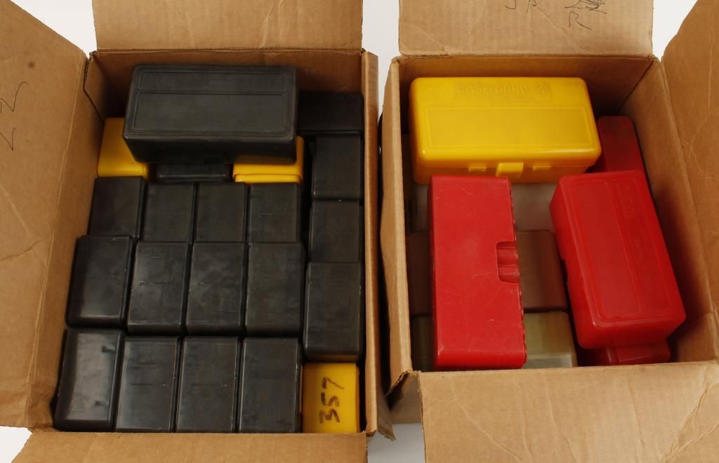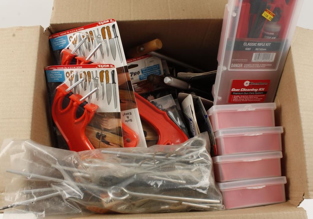 Includes cotton patches for .22, .22-270, .38-45, 12 & 16 ga; bronze & stainless bore brushes for .177-200, .22, .25, 9mm, .357, .45, .32, .40, 12 ga, 20 ga, and more; Kleen Bore SS gun brushes; misc cleaning rods, tubes of Flitz Polish, Edgemaker pro sharpeners & hones; plus plastic ammo boxes for both rifle and pistol caliber's.