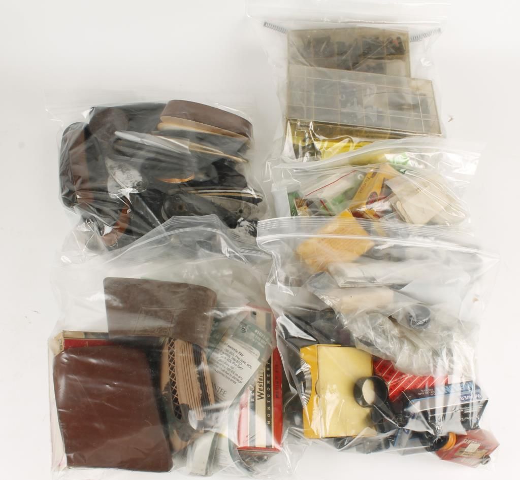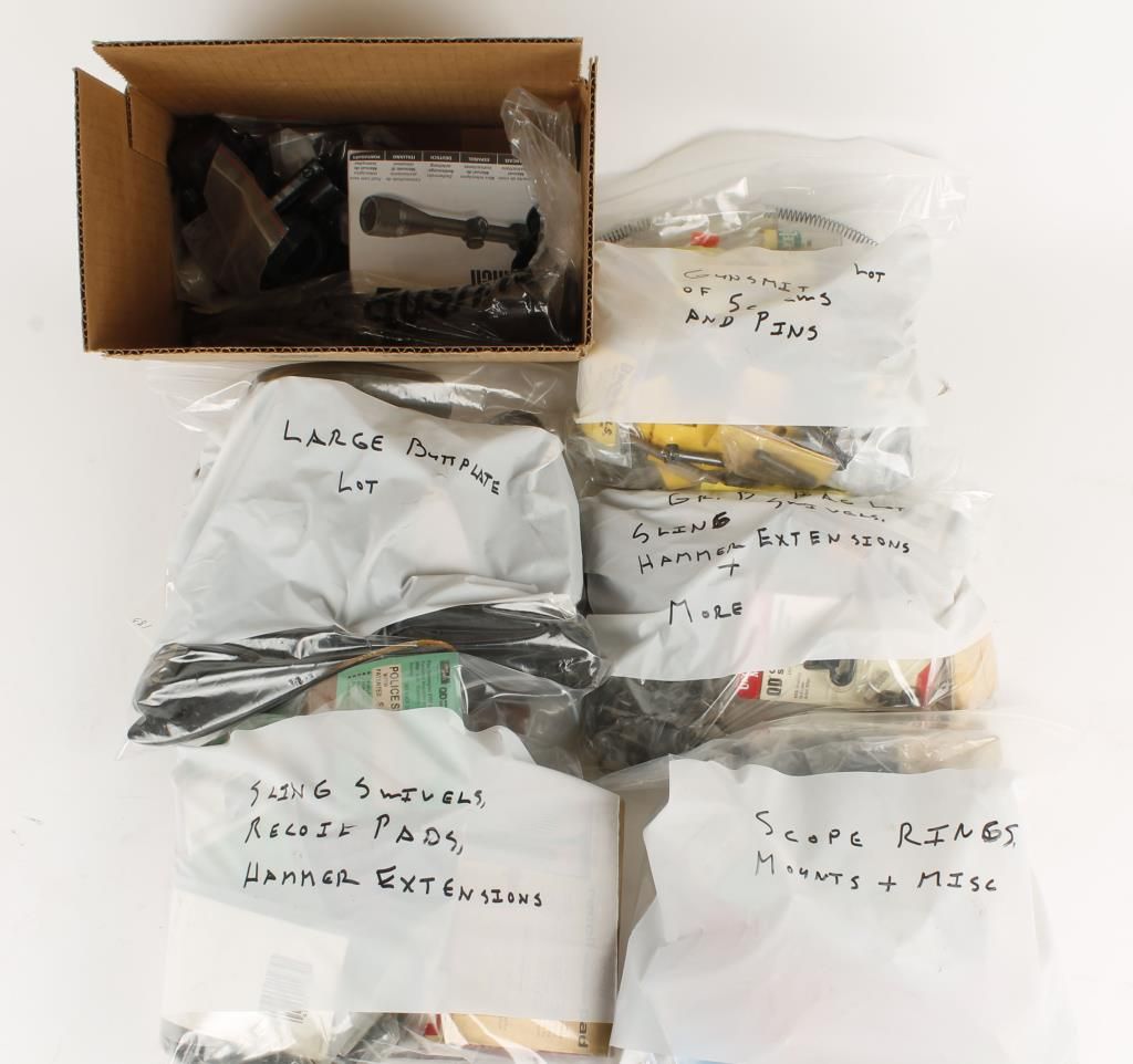 Includes 13 sets QD swivels, mounting hardware for various shotguns and rifles; 2 sets QD police shotgun swivels; most Uncle Mikes and new hammer extensions, slip on and permanent new & used recoil pads, boxes of screws and pins, sling swivels, studs, hammer extensions, scope mounts & lens caps, turret rings, butt plates both composite and steel with spacer and screws, and much more.