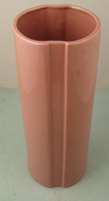 This large vase from Haeger Pottery has a sleek 1980's look and color. It is mauve, with vertical ridge along either side. The size is 15 3/4" tall x 6" in diameter. The underside has the original Haeger stamp, marked American Made, Copyright 1984. The vase is in excellent condition, with no chips or cracks.