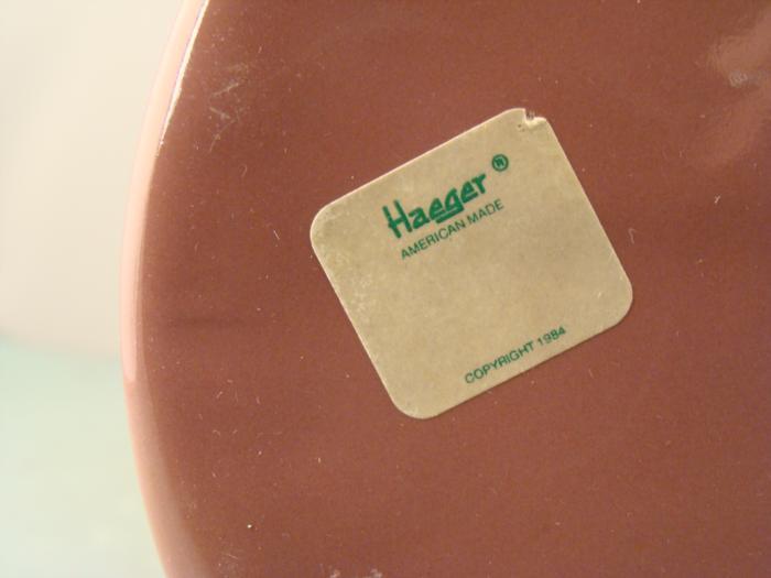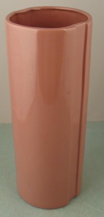 This large vase from Haeger Pottery has a sleek 1980's look and color. It is mauve, with vertical ridge along either side. The size is 15 3/4" tall x 6" in diameter. The underside has the original Haeger stamp, marked American Made, Copyright 1984. The vase is in excellent condition, with no chips or cracks.