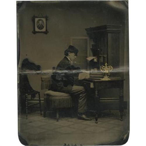 <B>Large Half Plate Tin Type of Student with Picture of General U. S. Grant in Background, </B></I>4.25" x 5.5", rounded bottom corners, a center fold. A wonderful, clear image, of a young man seated at a desk with a tinted urn at his side. A picture of General Grant looks paternally down from the wall. Some image loss else near fine. <B></B></I><BR><BR><b>Shipping:</b> Flat Material, Small (<a target="_blank" href="http://www.heritageauctions.com/common/shipping.php">view shipping information</a>)