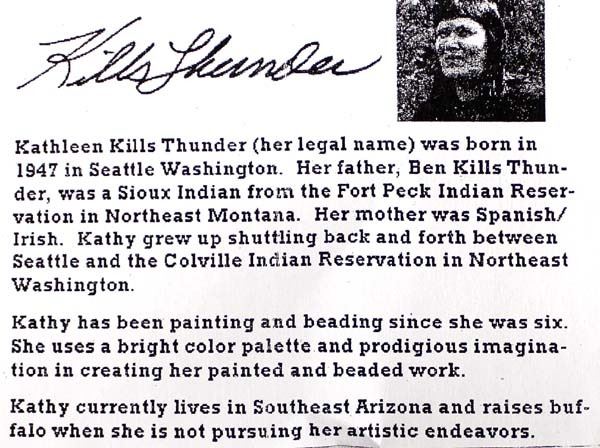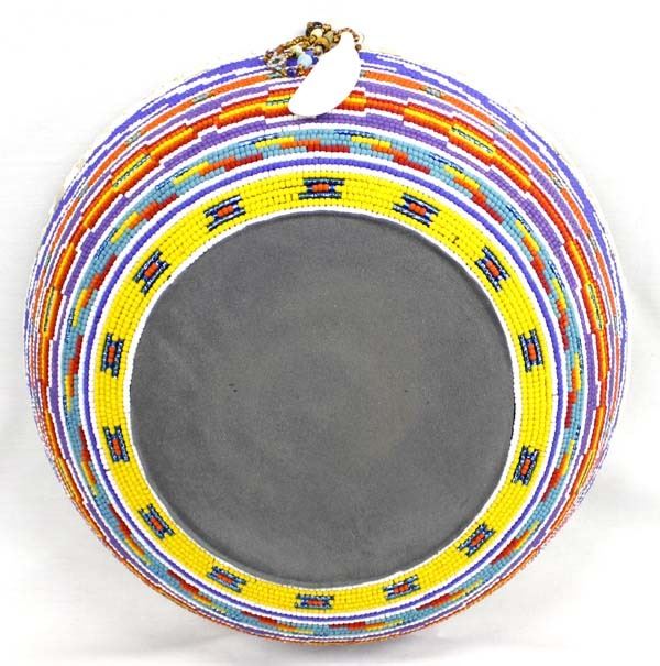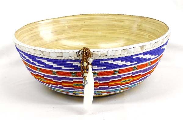 Large Hand Beaded Bamboo Bowl by Kathy Kills Thunder, measures 5''H x 15''D, beautifully beaded in vibrant colors, beaded feather dangle accent, Artist Bio: Kathleen Kills Thunder (her legal name) was born in 1947 in Seattle, WA. Her father, Ben Kills Thunder, was a Sioux Indian from the Fort Peck Indian Reservation in NE Montana and her mother was Spanish/Irish. Kathy has been painting and beading since she was six.