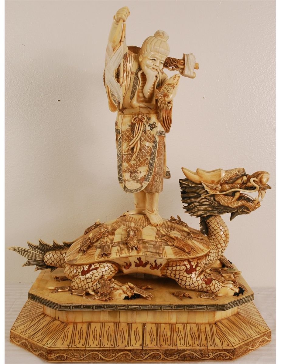 Hand carved Asian bone fisherman standing on tortoise dragon. Exquisitely detailed carvings of tortoise with dragon head and claws. Fisherman standing on top with fish and staff in hand. Multiple tortoises climbing towards fisherman. On large octagonal bone carved stand. Hand painted. Priceless! Great conversation piece. You will not be disappointed! 26"H x 22"L x 17"W.