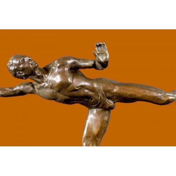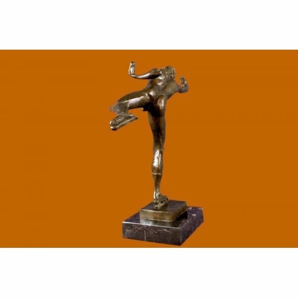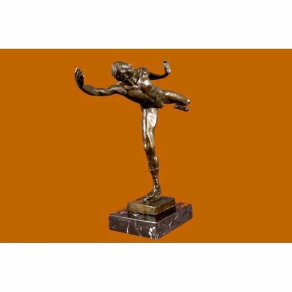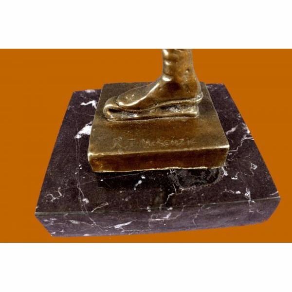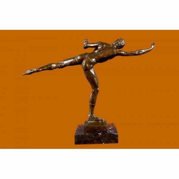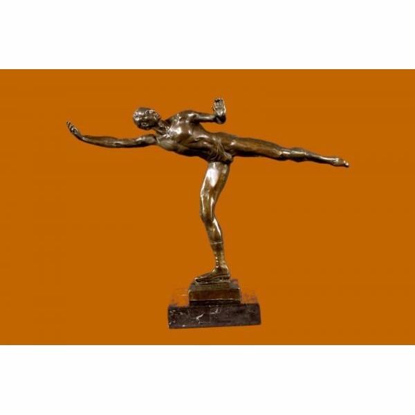 A handsome skater puts on a show. Well trained in the art that he loves, he shows off his agility, balance and flexibility. He elevates his long lean leg far behind him. His finger tips graze his calf and he gracefully outstretches his other slender arm to the sides of his. His chest pushes out and his head tips forward; basking in the glory of center stage. Every movement is deliberate and structured, from the tips of his toes to the tips of his fingers. Not even his hair moves without his intention. He trained for many years for the moment when he would be the center of the spotlight. 100% bronze, this handmade brown and is signed by American artist Robert Tait McKenzie.This sculpture was cast using the "Lost Wax Method" and mounted on a black marble base. Condition: This sculpture is in perfect condition. Bronze Dimensions with Marble Base:Height 12" x Width 16" Marble Dimensions: 5' X 5". Height without base: 11" Weight : 9 LBS Inventory 51XNCH2543B6715