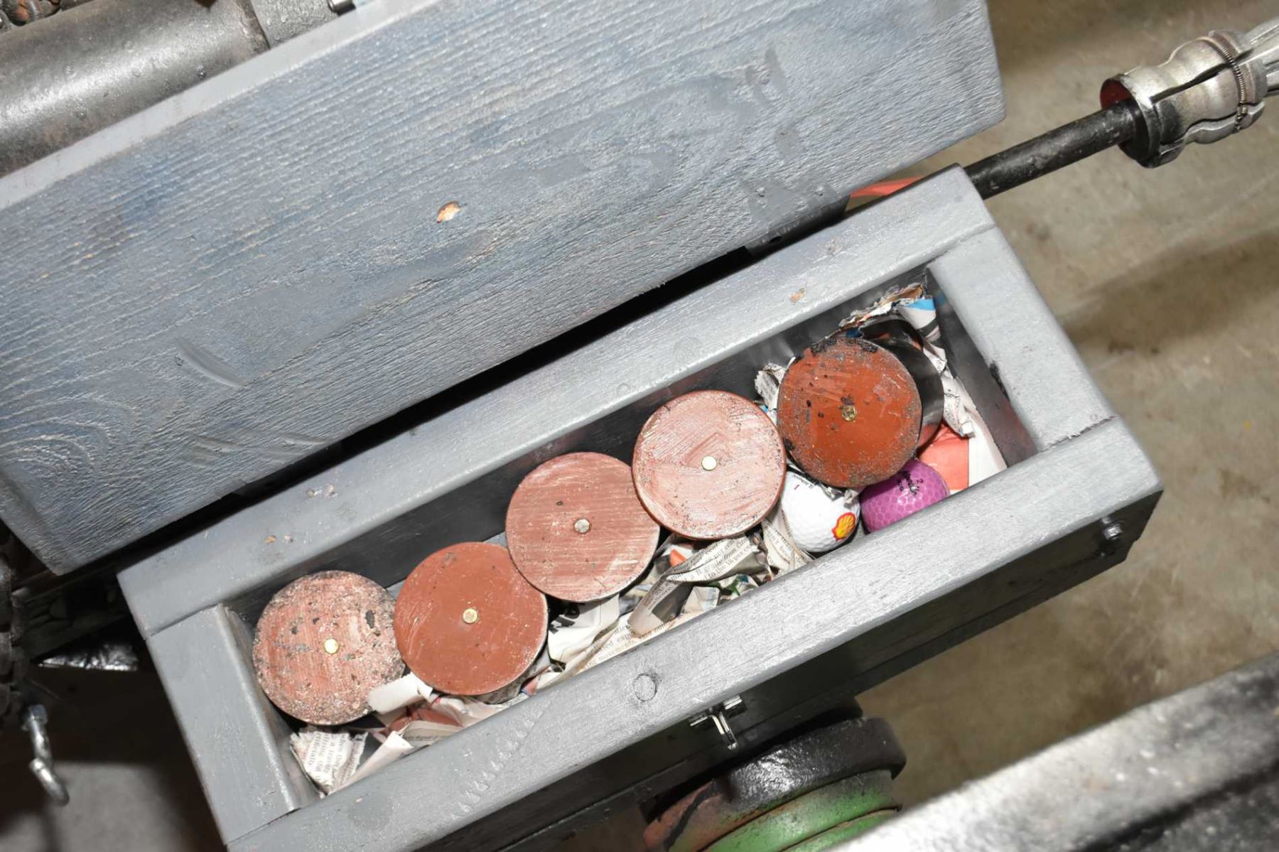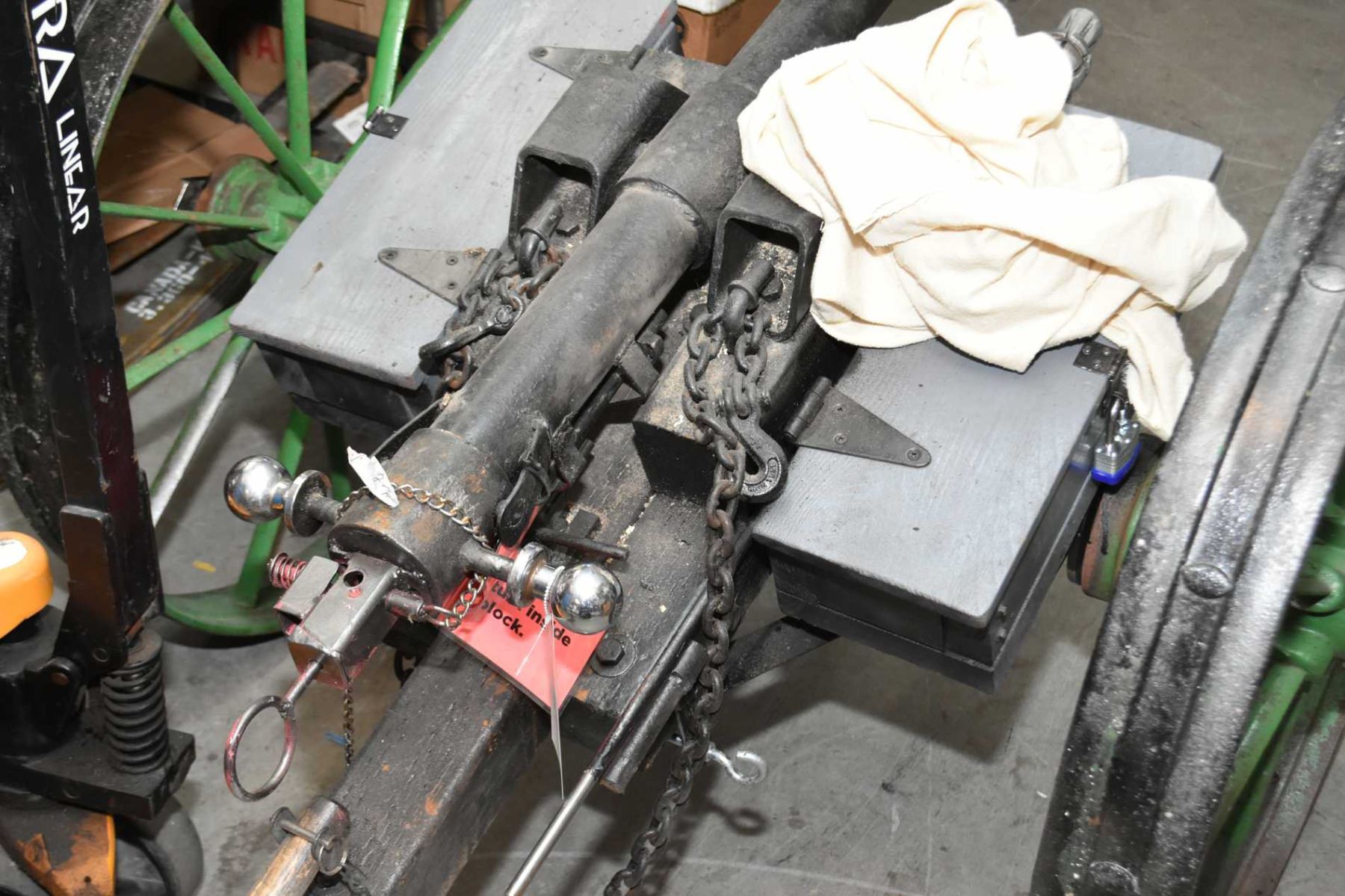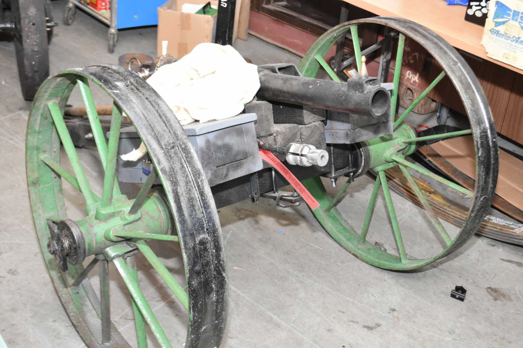 Large Hand Made Breech Loading 2 "Bore Cannon Approx 34" Barrel, 51" Wide, 77 " Over All Length, 32" Wheel, with two ammunition boxes [ has turn pike reamer for cleaning barrel, elevation crank & golf balls, note : chain brakes for going up and down hills