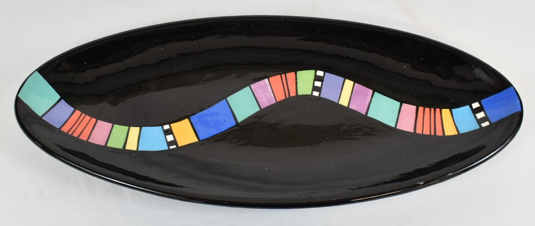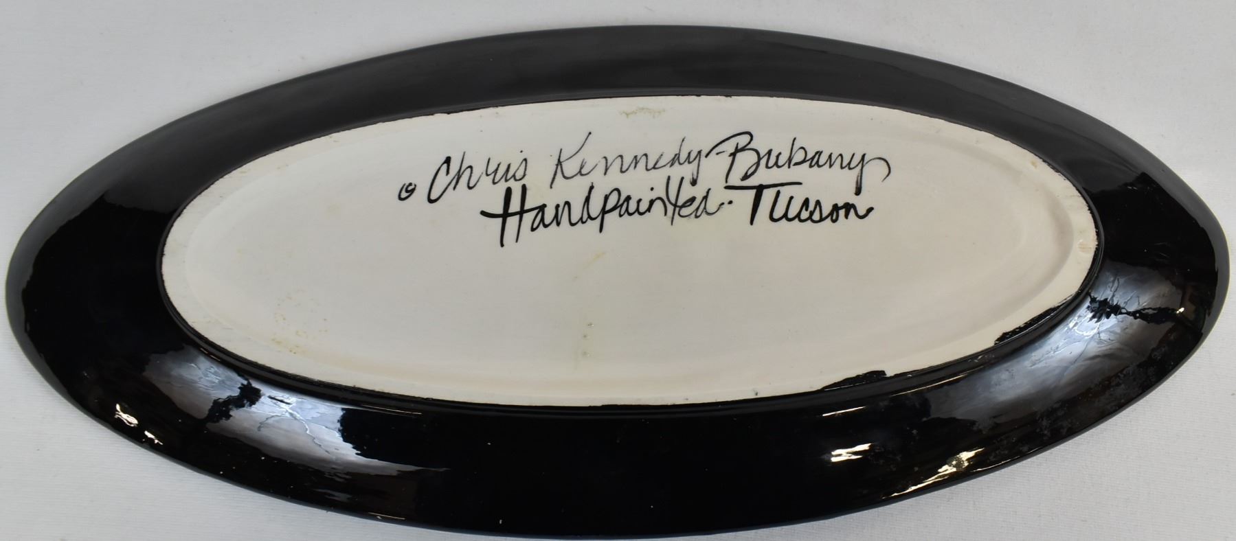Large Colorful Hand Painted Ceramic Tray by Chris Kennedy-Bubany of Tucson AZ, measures 9'' x 21'' and is signed on the back, beautiful colors, FYI: ''Chris Kennedy-Bubany is a native of the Southwest, born and raised in New Mexico. She has lived in Tucson, Arizona for over 30 years. Her parents were in the Indian Arts & Crafts business and her grandparents were traders in the early 1900's.''