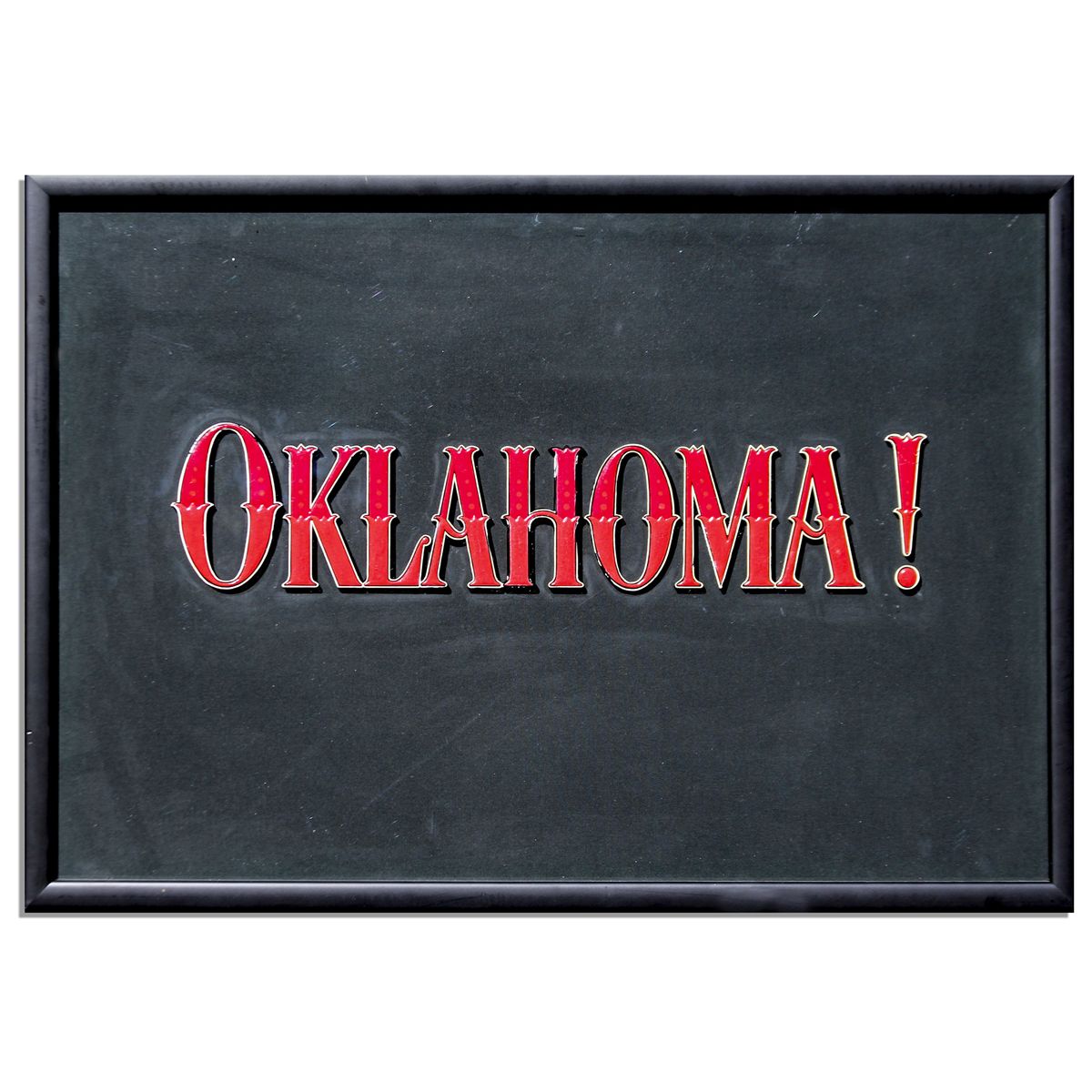 Original movie title art filmed in the opening of the 1955 musical film ''Oklahoma!''. Striking lettering is hand-painted on a pane of glass in two shades of red with a thin white outline. Paint on the lower half of the letters is raised, lending a three-dimensional look to the title, and three dots of contrasting red adorn the top half of each letter. Pane is framed against a slate grey background and protected by a clear outer layer. Measures 33.5'' x 23.5''. Slight imperfections to fine white outline of letters. Original movie title artworks superior to this have sold for up to almost $200,000 each at Profiles in History. Near fine.