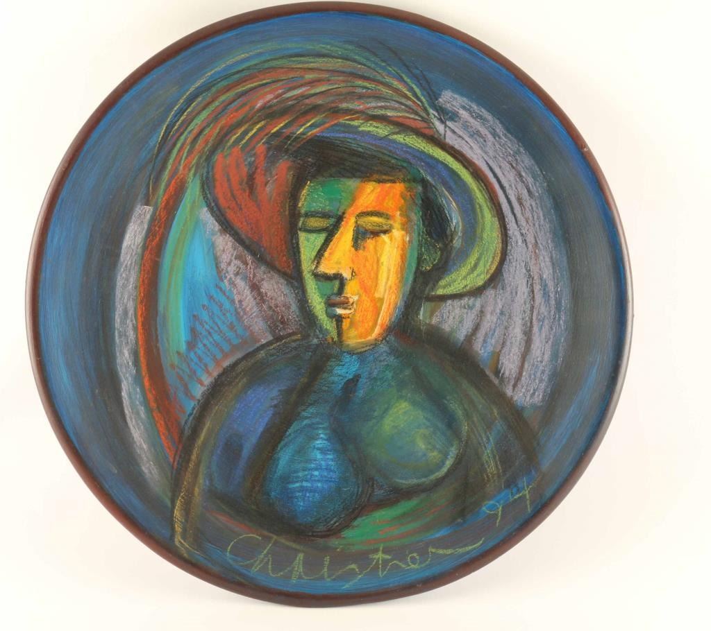 Double sided plate 17 1/4" dia signed 'Chaistner 94'.. Both sides have abstract painted portraits of women.
