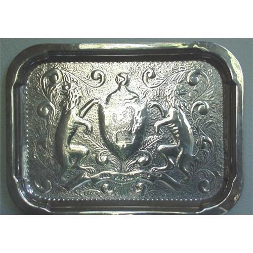 <tr><td>Title:Large Hand Tooled Silver Tray with Family Crest</td></tr>