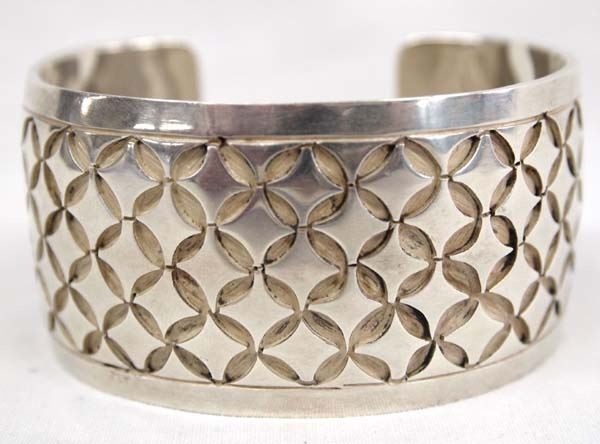 Large, Heavy Sterling Silver Cuff Bracelet, inside measures 7.25'' which includes opening x 1.25''W, stamped .925, carved flower designs, 67.48g in total wt.