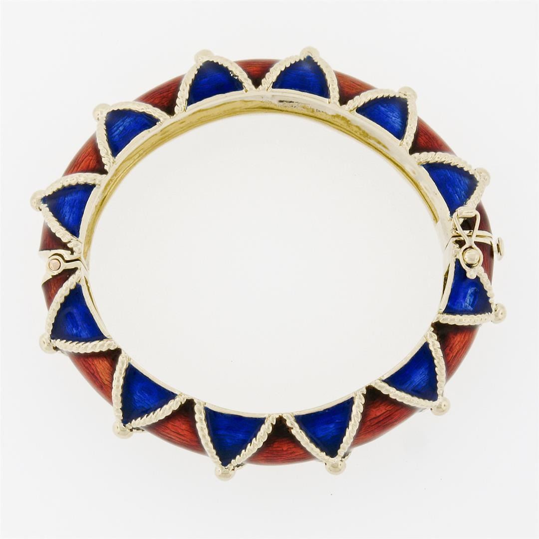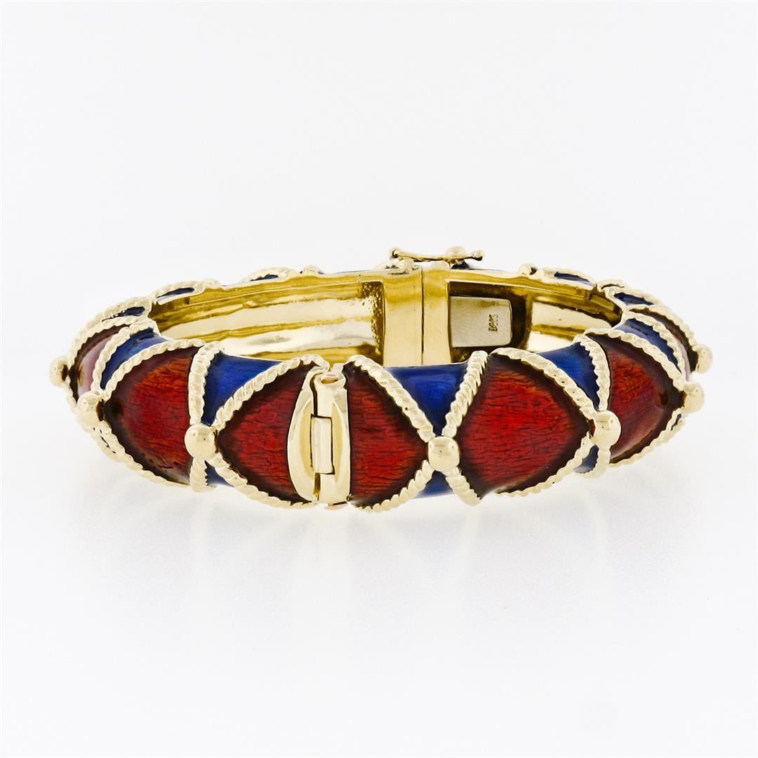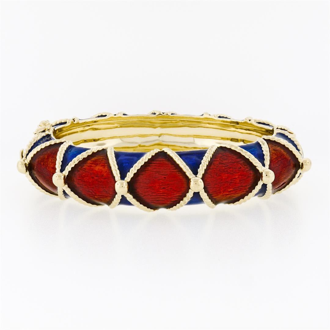 A vintage solid 14k yellow gold bangle bracelet, with red and blue enamel work. It weighs a total of 85.65 grams, measures 37.50mm wide, and measures 7 inches in length.