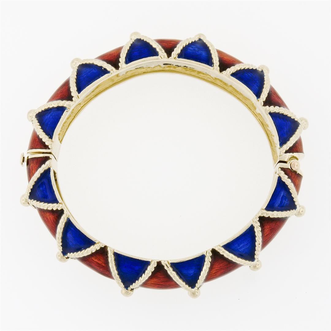 A vintage solid 14k yellow gold bangle bracelet, with red and blue enamel work. It weighs a total of 85.65 grams, measures 37.50mm wide, and measures 7 inches in length.
