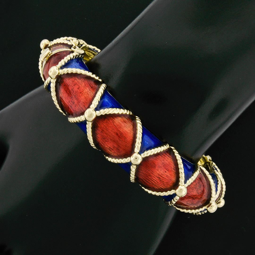 A vintage solid 14k yellow gold bangle bracelet, with red and blue enamel work. It weighs a total of 85.65 grams, measures 37.50mm wide, and measures 7 inches in length.