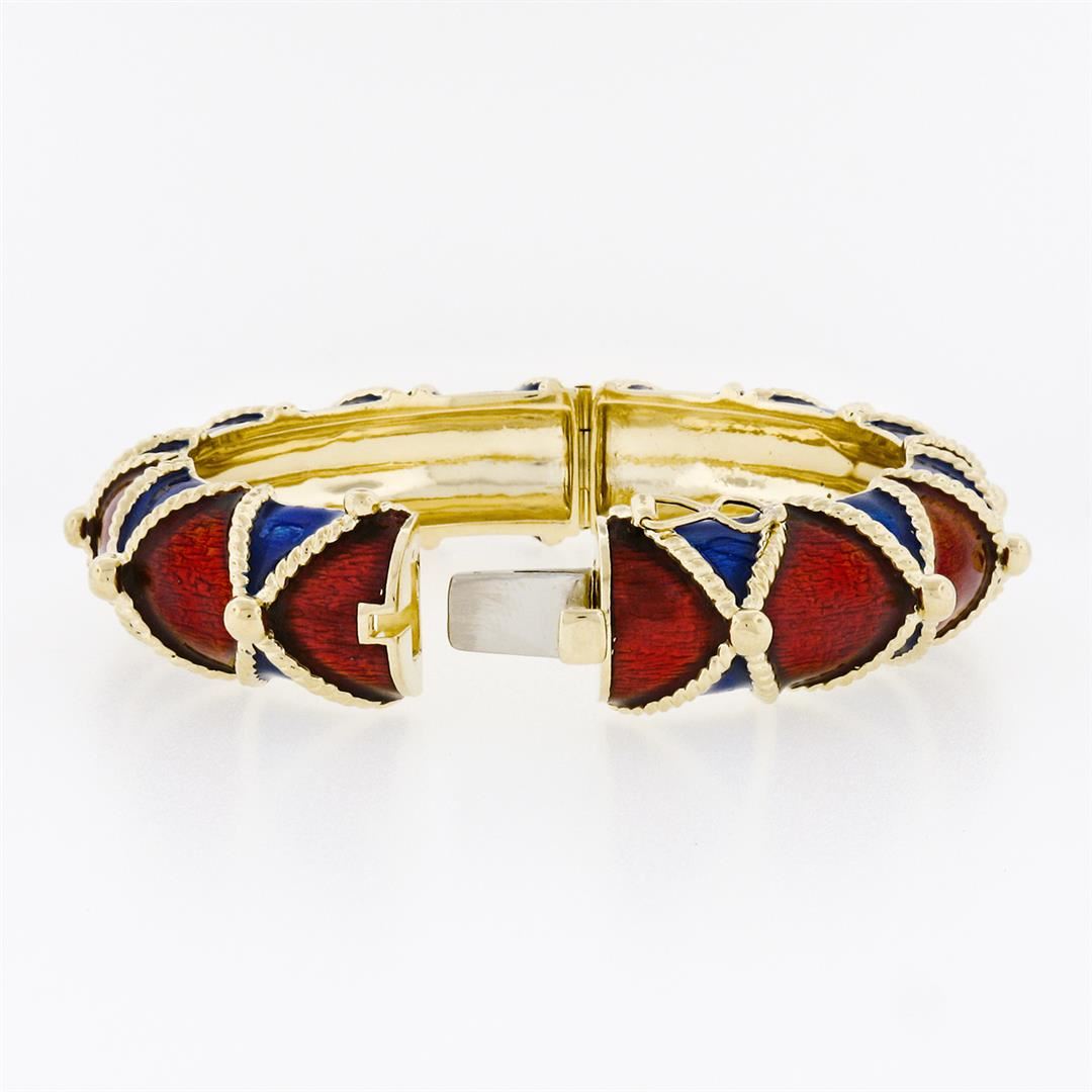 A vintage solid 14k yellow gold bangle bracelet, with red and blue enamel work. It weighs a total of 85.65 grams, measures 37.50mm wide, and measures 7 inches in length.