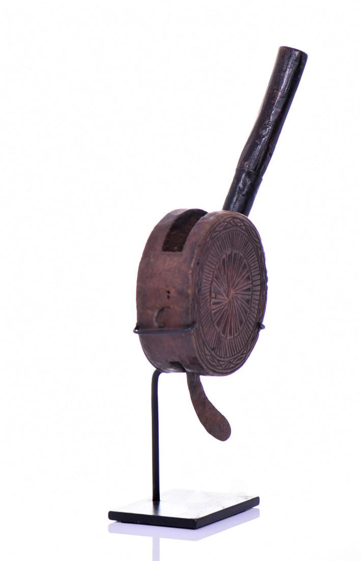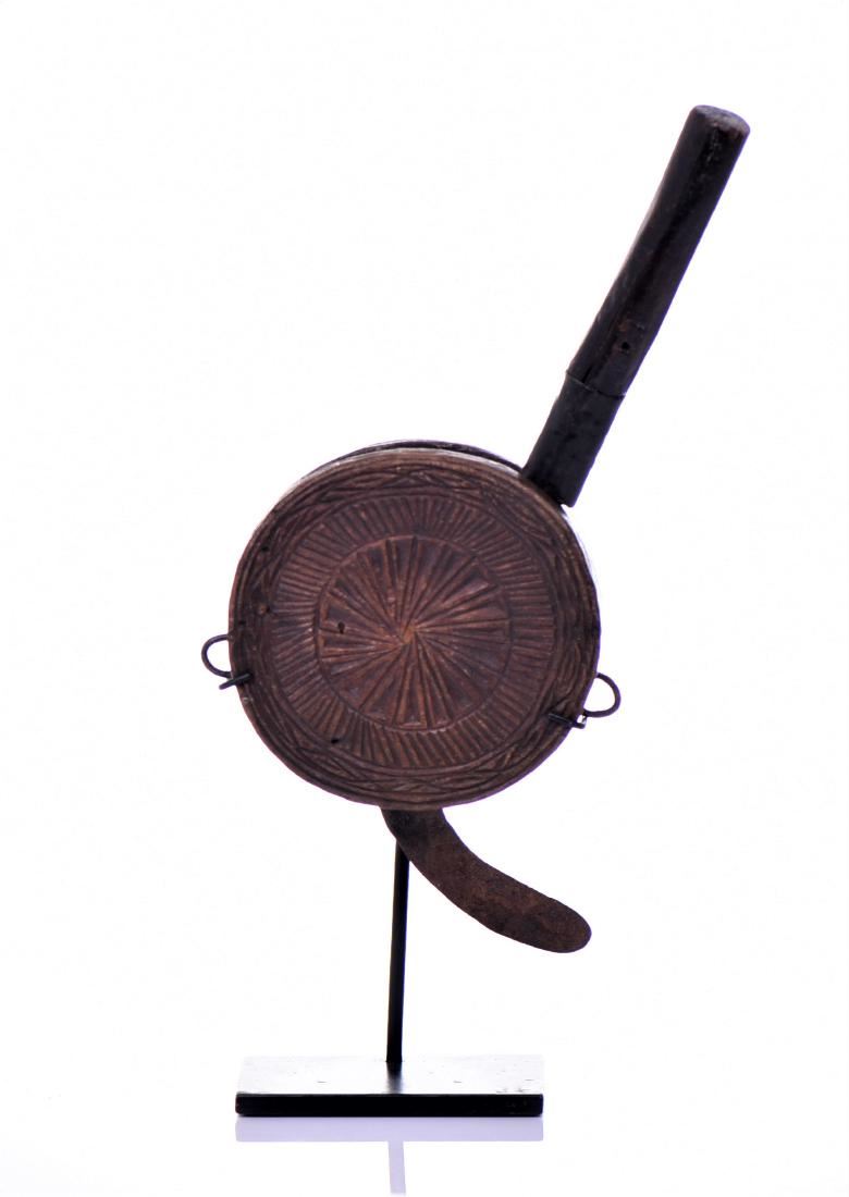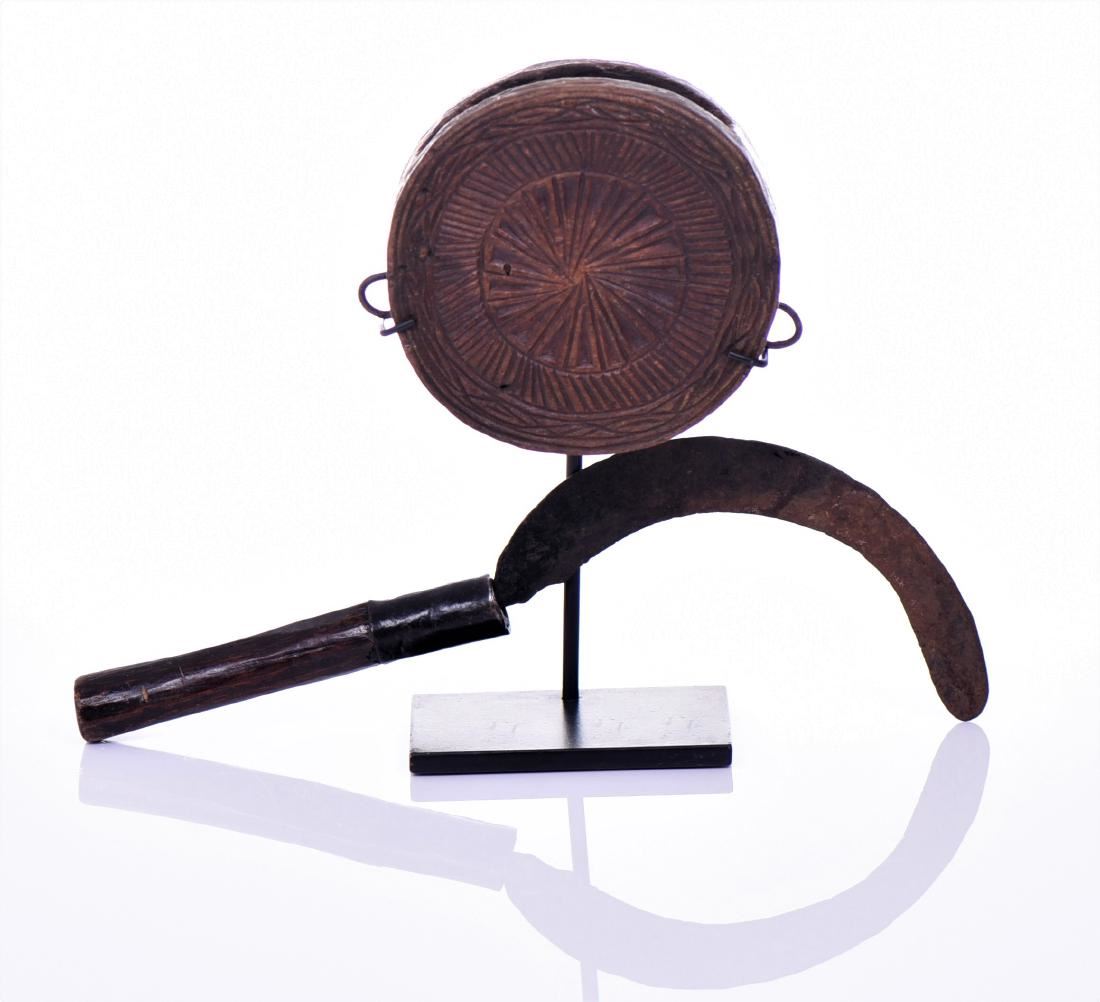 Large Himalayan Rice Knife (Scythe), Nepal. Made From Wood And Steel. There are many cultural aspects of the Himalayas. For the Hindus, the Himalayas are personified as Himavath, the father of the goddess Parvati. The Himalayas is also considered to be the father of the river Ganges. The Mountain Kailash is a sacred peak to the Hindus and is where the Lord Shiva is believed to live. Provenance: Ethnographic Tribal Museum Collection (See Auction Catalog Description). Some Lots Have Been On Exhibition And Have A Custom Made Metal Stand Specifically Designed To Fit The Work. Estimated more than 75 yrs old. (Pangaea Auctions) Size and/or Weight: See Measurement Photo. (Photos Represent The Lot Condition.)