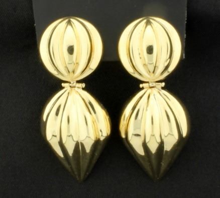 In 14K yellow gold, they are 2 inches long and have friction backs. 8.7g
