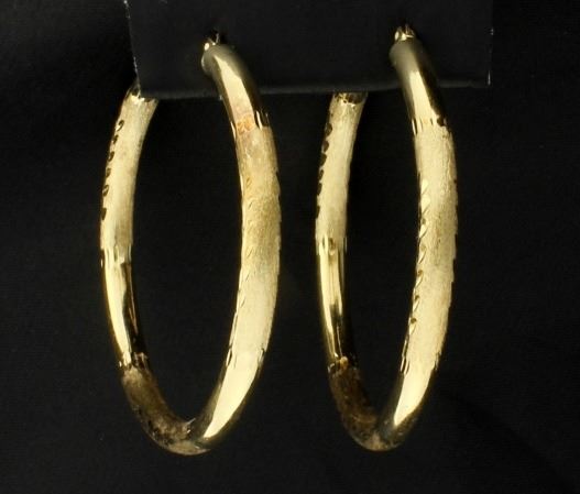 In 14K yellow gold, they have a leaf design and are about 2 inches in diameter. 5.3g