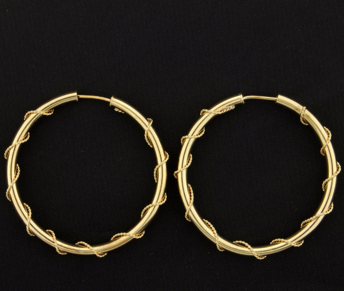They are 14K yellow gold, and have a twisted rope design around the hoops. They are 1 3/8 inches in diameter. 3.8g