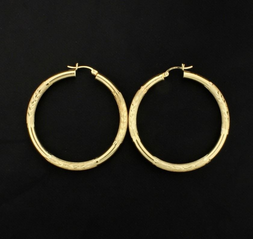 In 14K yellow gold, they have a leaf design and are about 2 inches in diameter. 5.3g