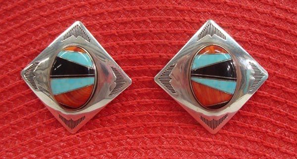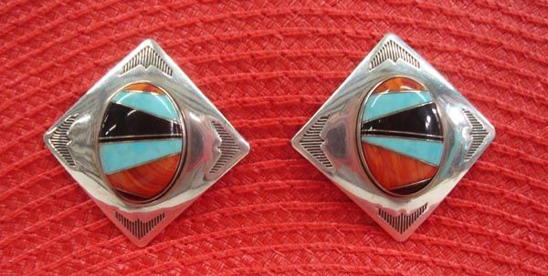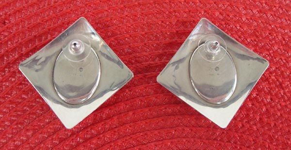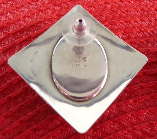 Large Hopi Channel Inlay Sterling Pierced Earrings. Measure 1.25'' square. Hallmarked with a Zia symbol and stamped ''sterling'', these earrings make a statement.