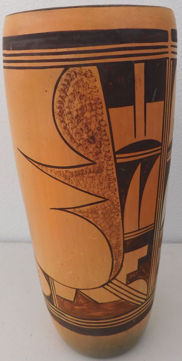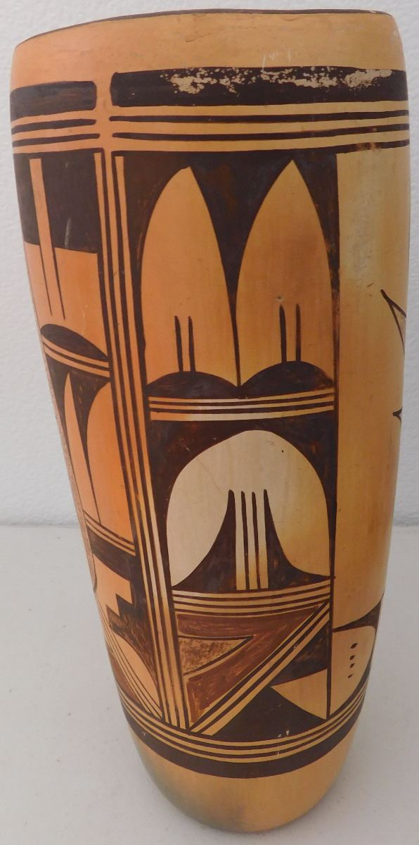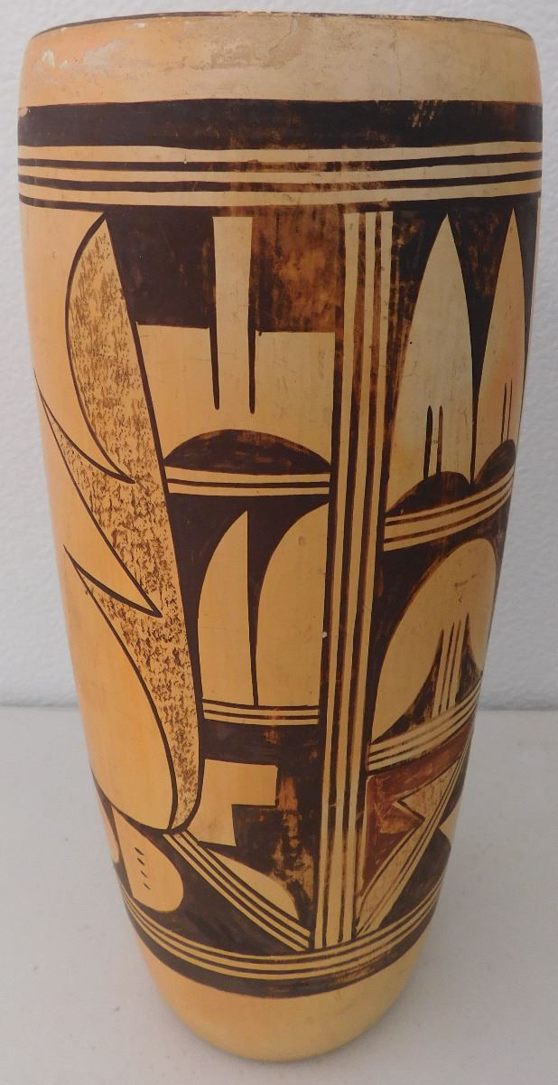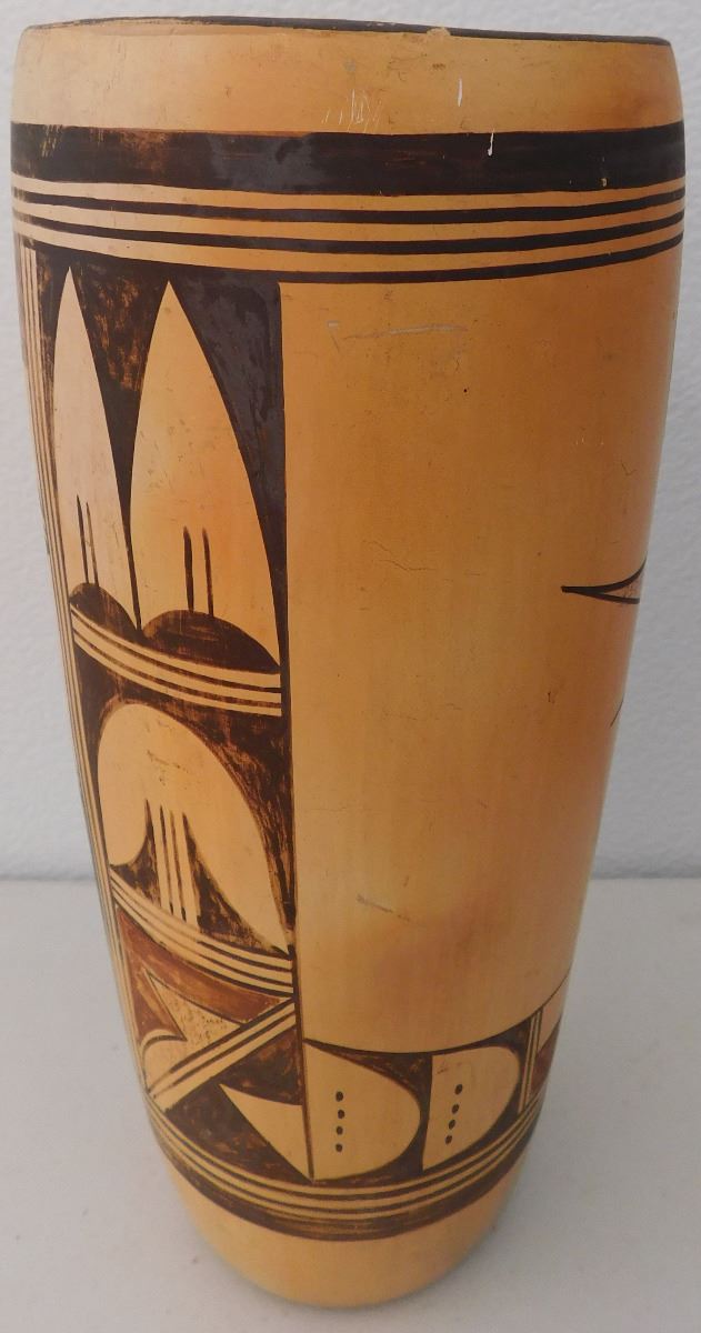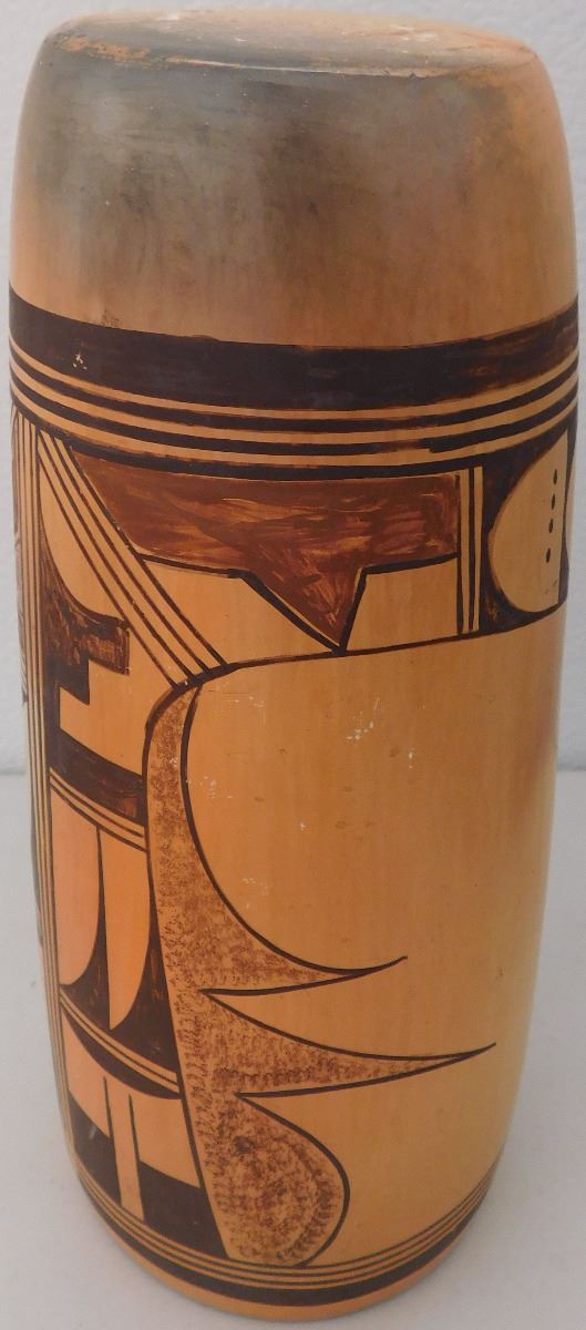 Large Hopi Cylinder, from the 1940's. This clay and paint item measures 11 x 5 inches. Hopi, Northern-Central Arizona. Condition: There are minor paint scuffs with nice paint and a design, see images. Shipping: $32.00 w/insurance.