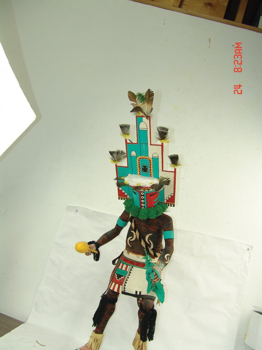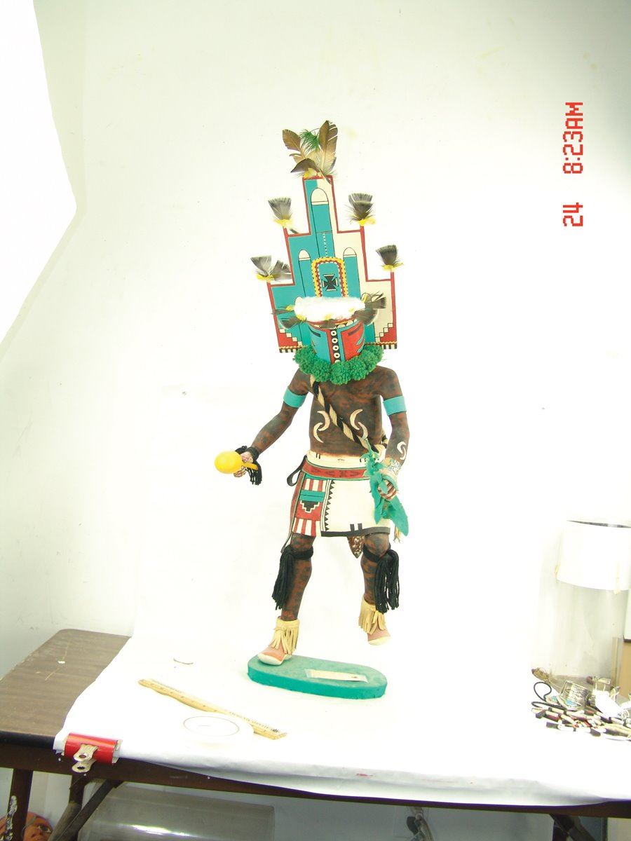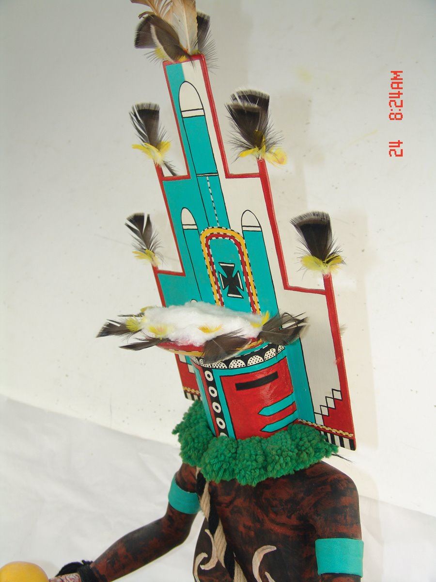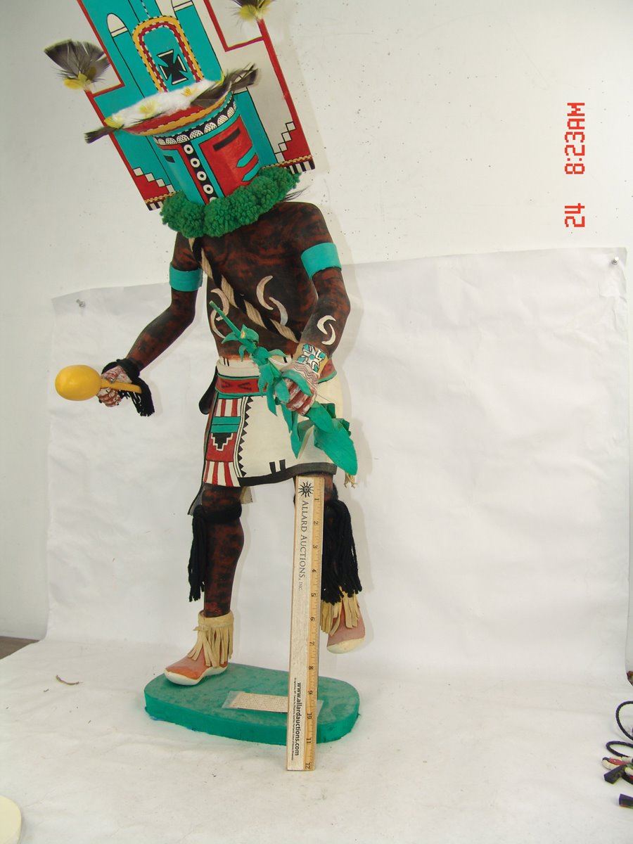 Huge vintage hand carved and painted cottonwood root "Hemis" doll with removable headdress, rattle, and cornstalk wand. Very good condition, minor repairs. A large and impressive example.,,
