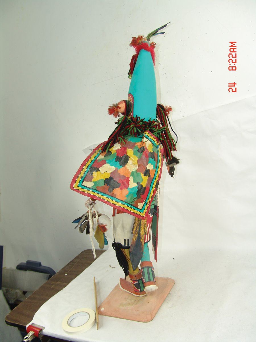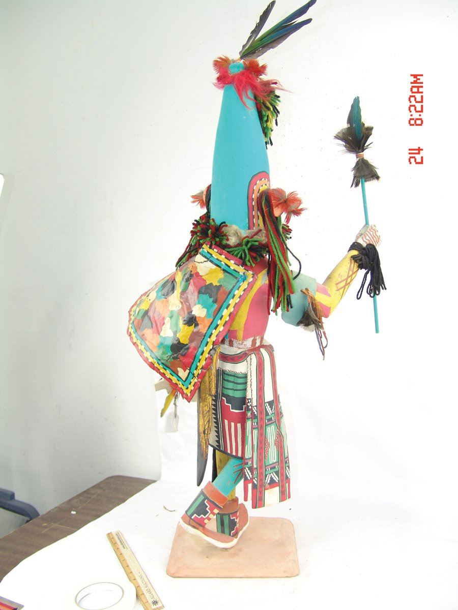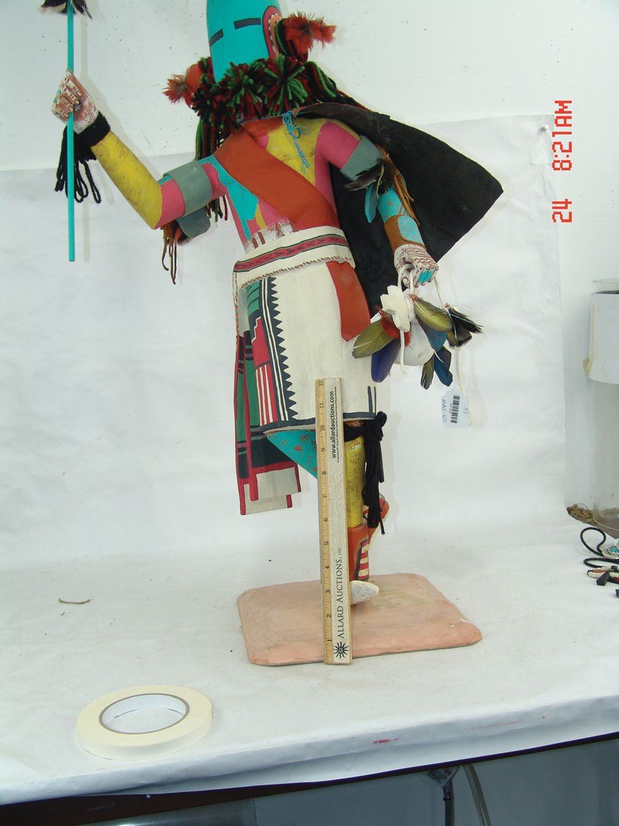 Huge, vintage, hand carved and painted cottonwood root "Aholi" doll, fully outfitted with mask, cape, sash, kilt, prayer stick, wand, and white gourd pot. Very good condition, minor repairs. A large and,,37"