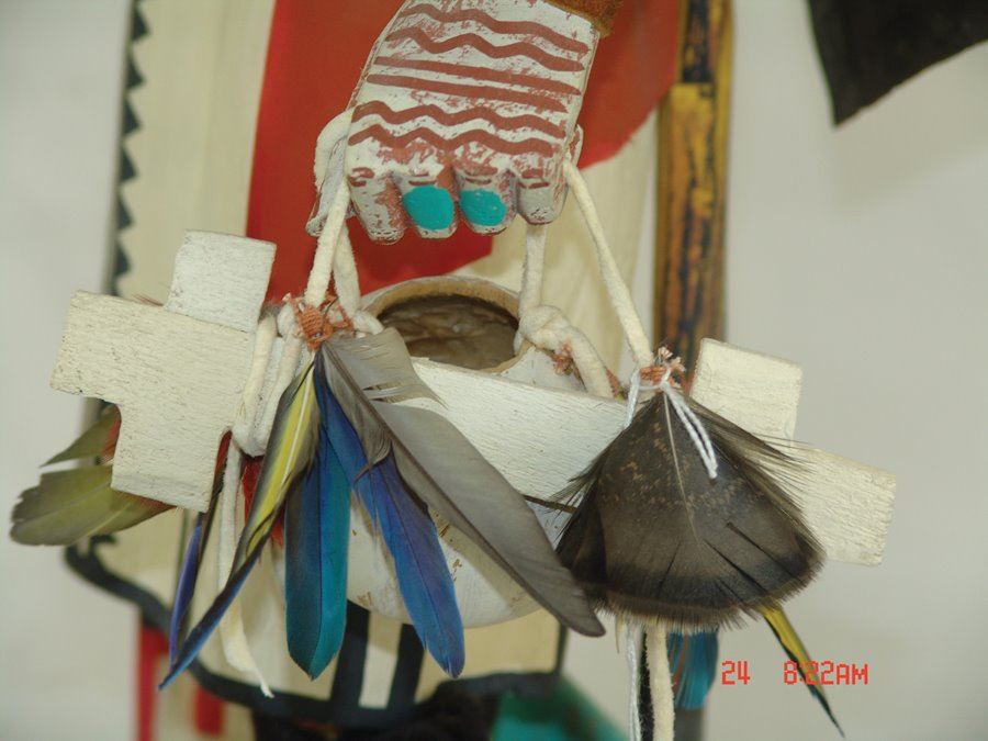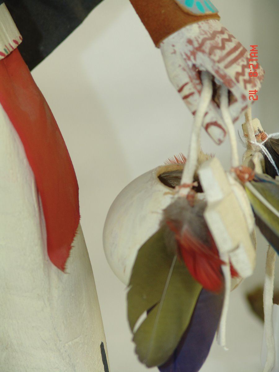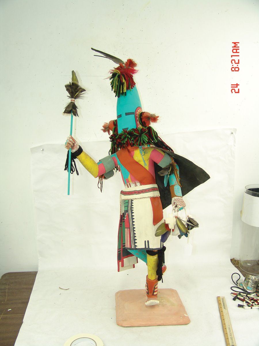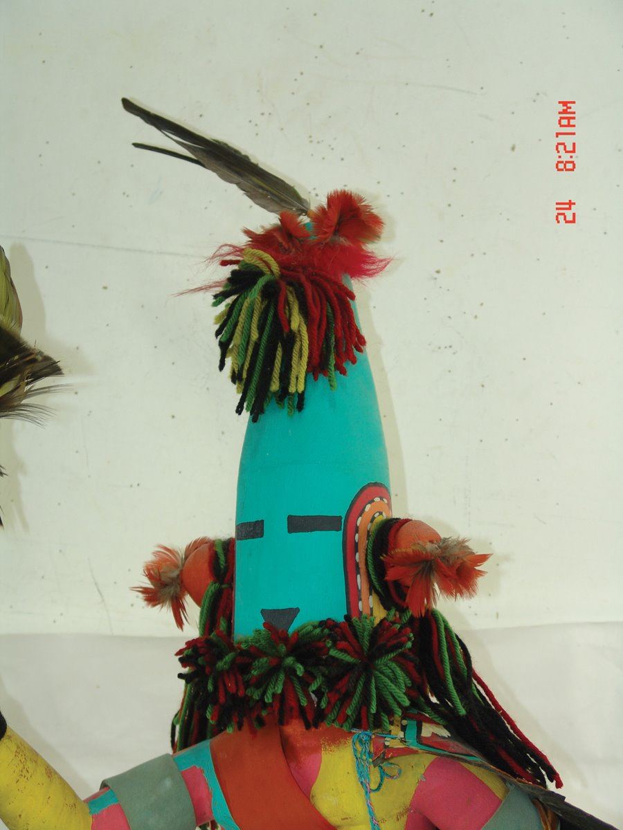 Huge, vintage, hand carved and painted cottonwood root "Aholi" doll, fully outfitted with mask, cape, sash, kilt, prayer stick, wand, and white gourd pot. Very good condition, minor repairs. A large and,,37"