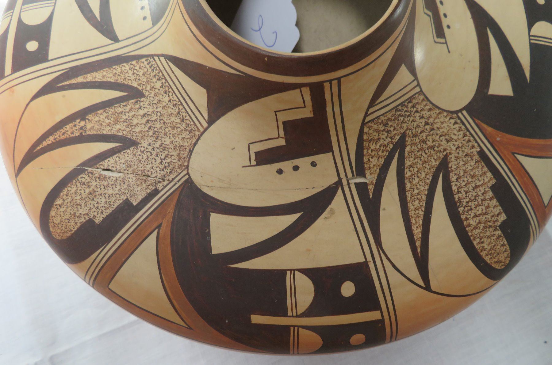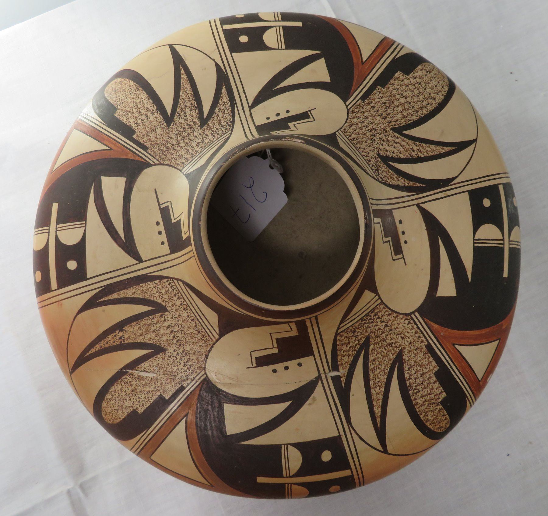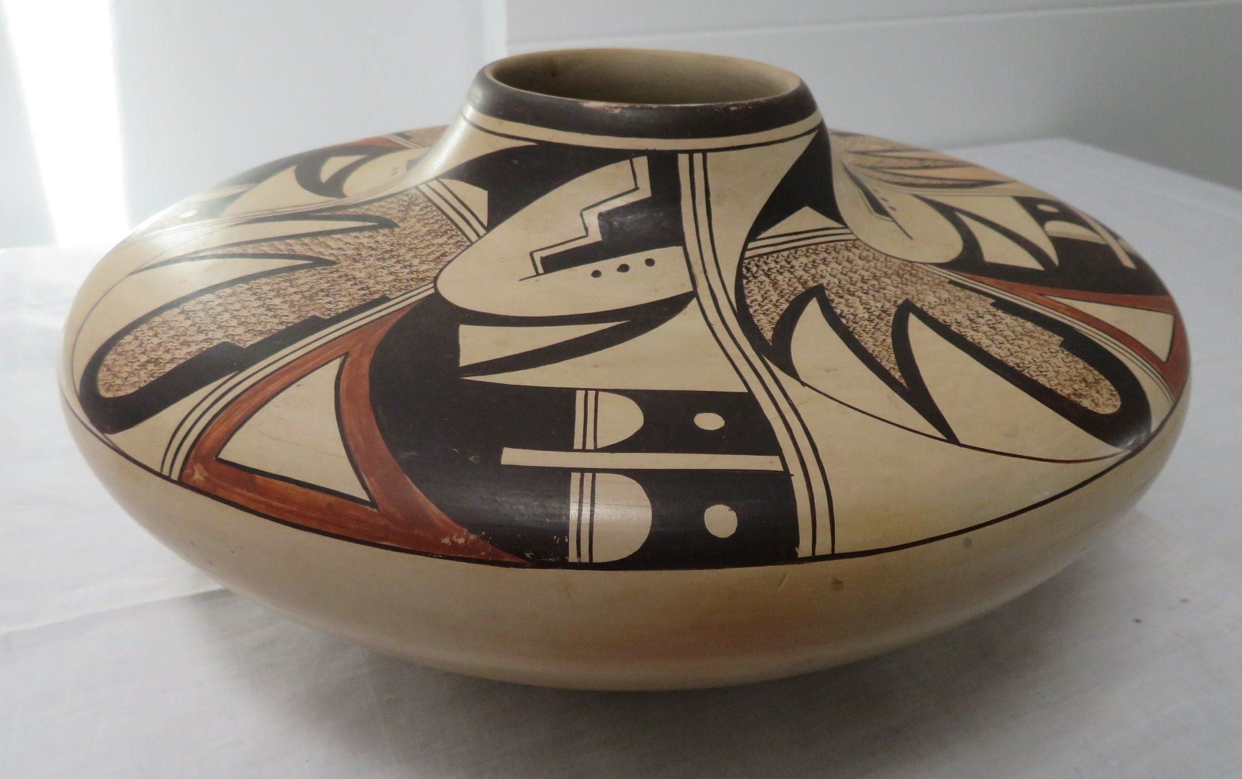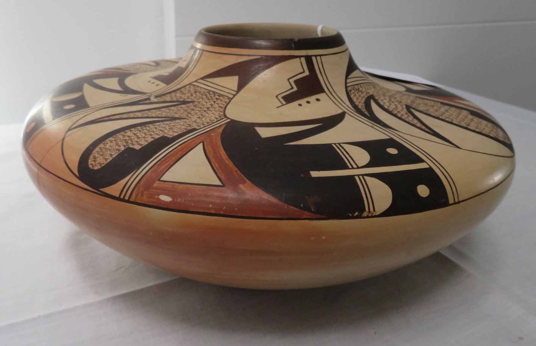 Large Hopi Olla, c. 1940s. Made of clay and paint, the item measures 11.5" x 11.5" x 5.5". Arizona, Hopi. Classic Hopi olla. Signed Little Fawn. Condition: Cracked and reattached, see images. Shipping: $40.00 USA estimate only, w/insurance and signature, double-boxed, due to size and weight.