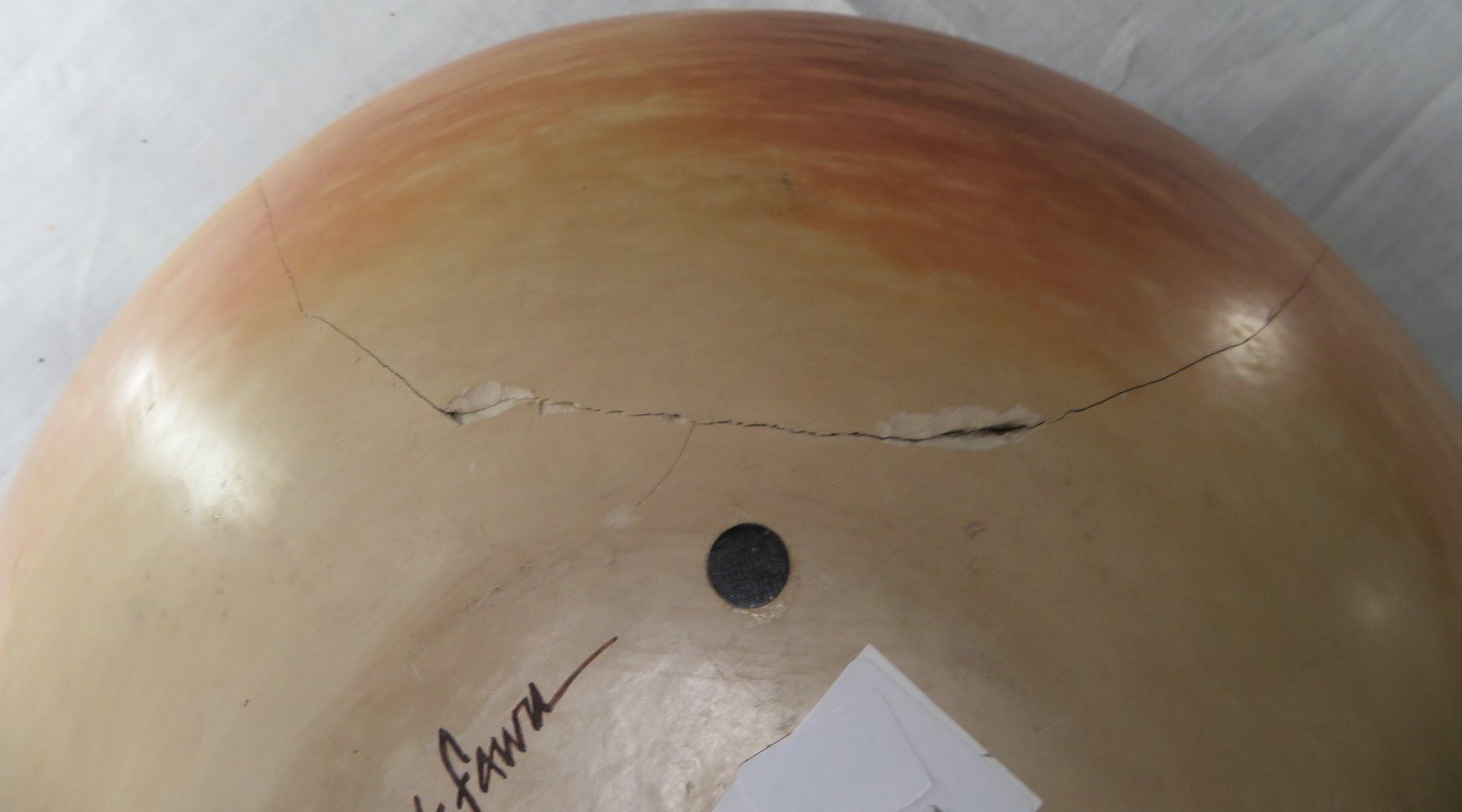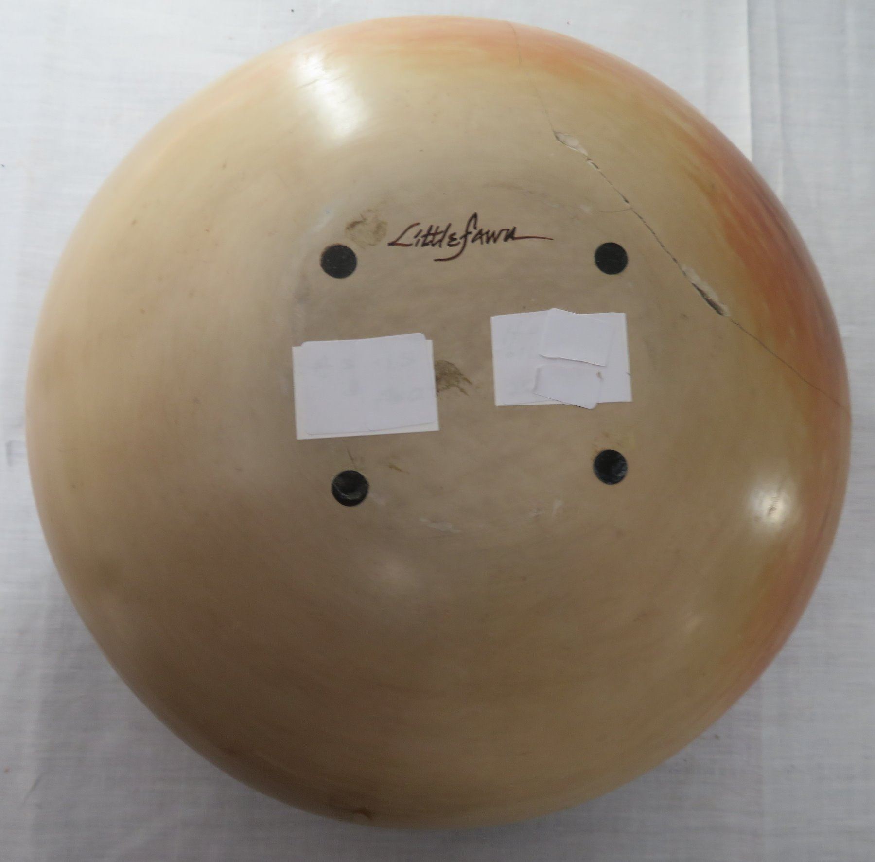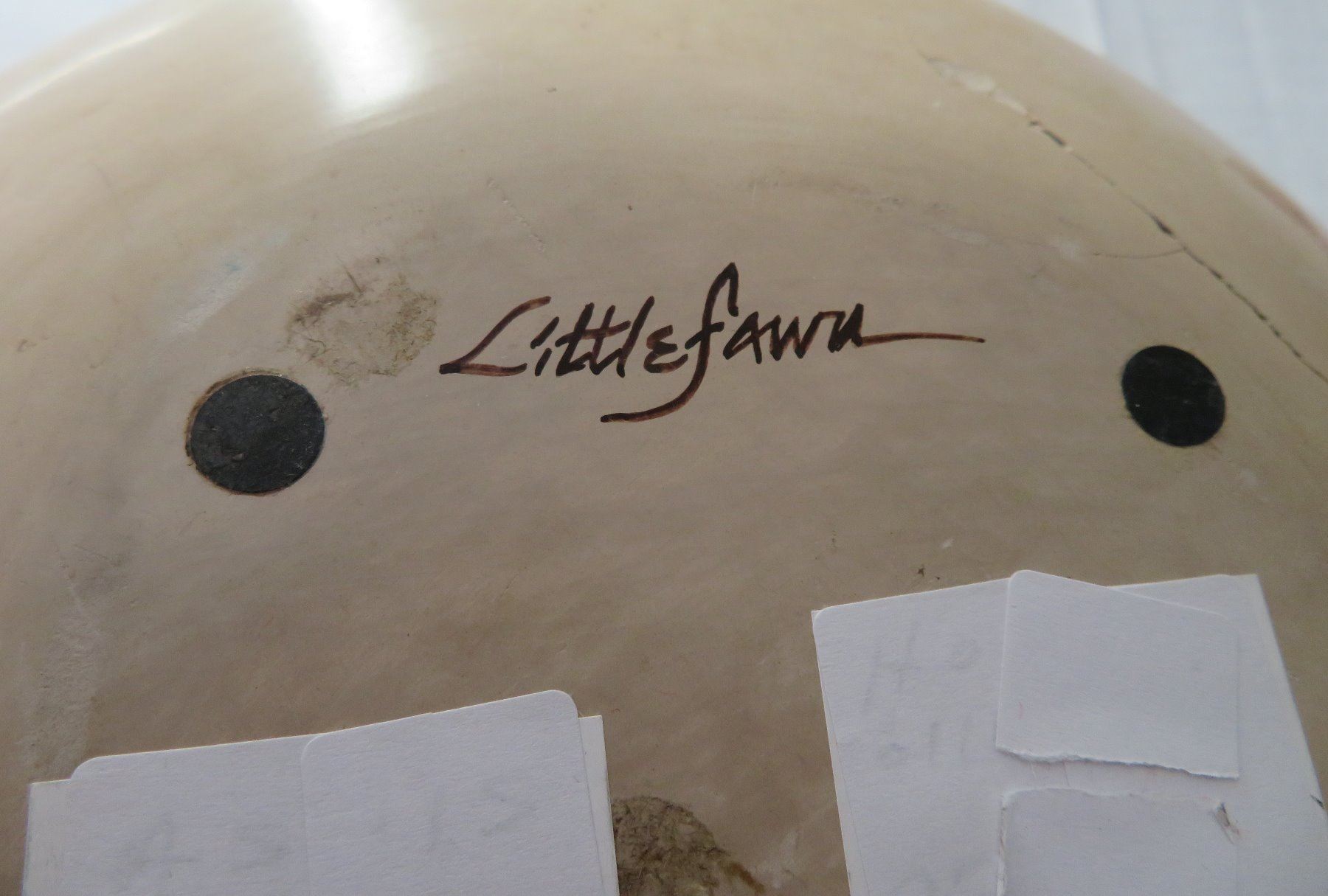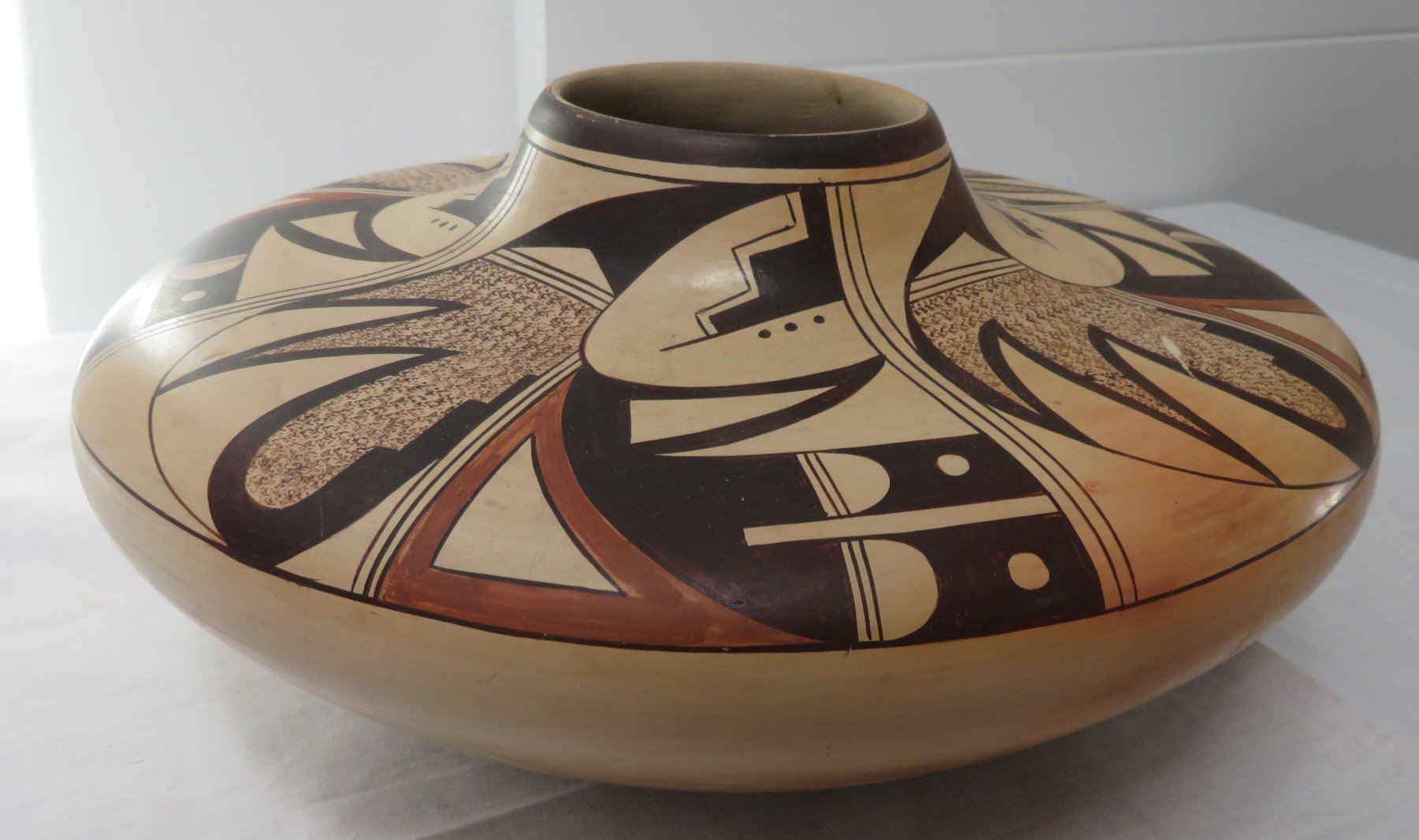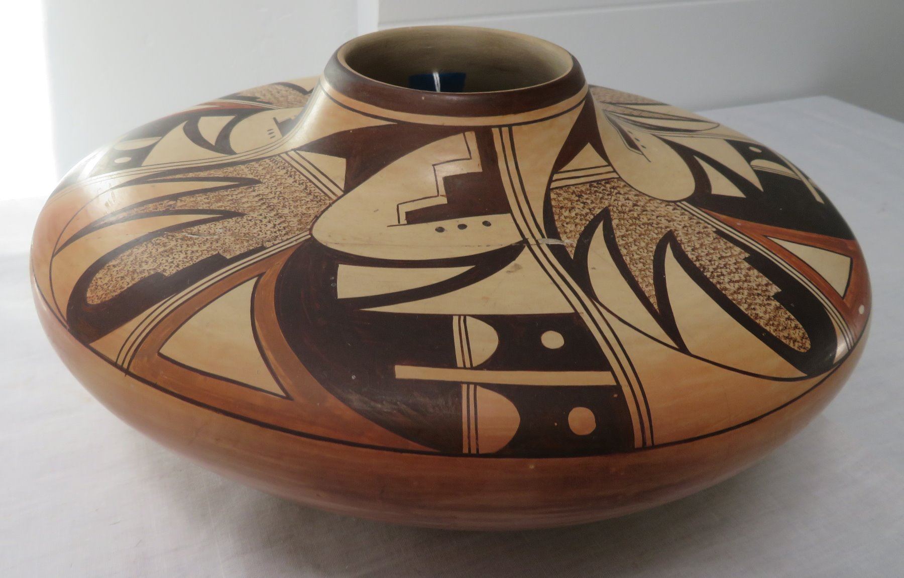 Large Hopi Olla, c. 1940s. Made of clay and paint, the item measures 11.5" x 11.5" x 5.5". Arizona, Hopi. Classic Hopi olla. Signed Little Fawn. Condition: Cracked and reattached, see images. Shipping: $40.00 USA estimate only, w/insurance and signature, double-boxed, due to size and weight.
