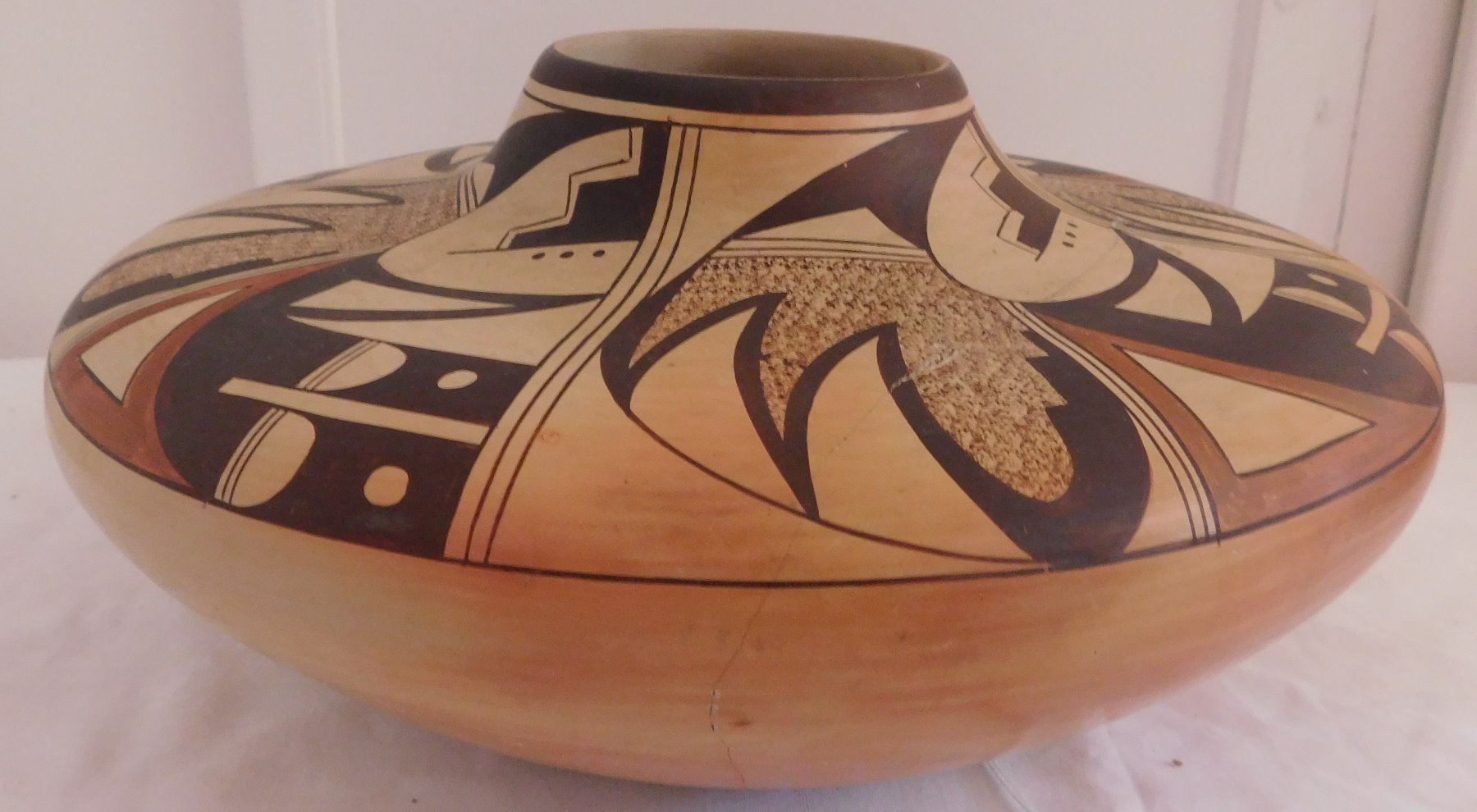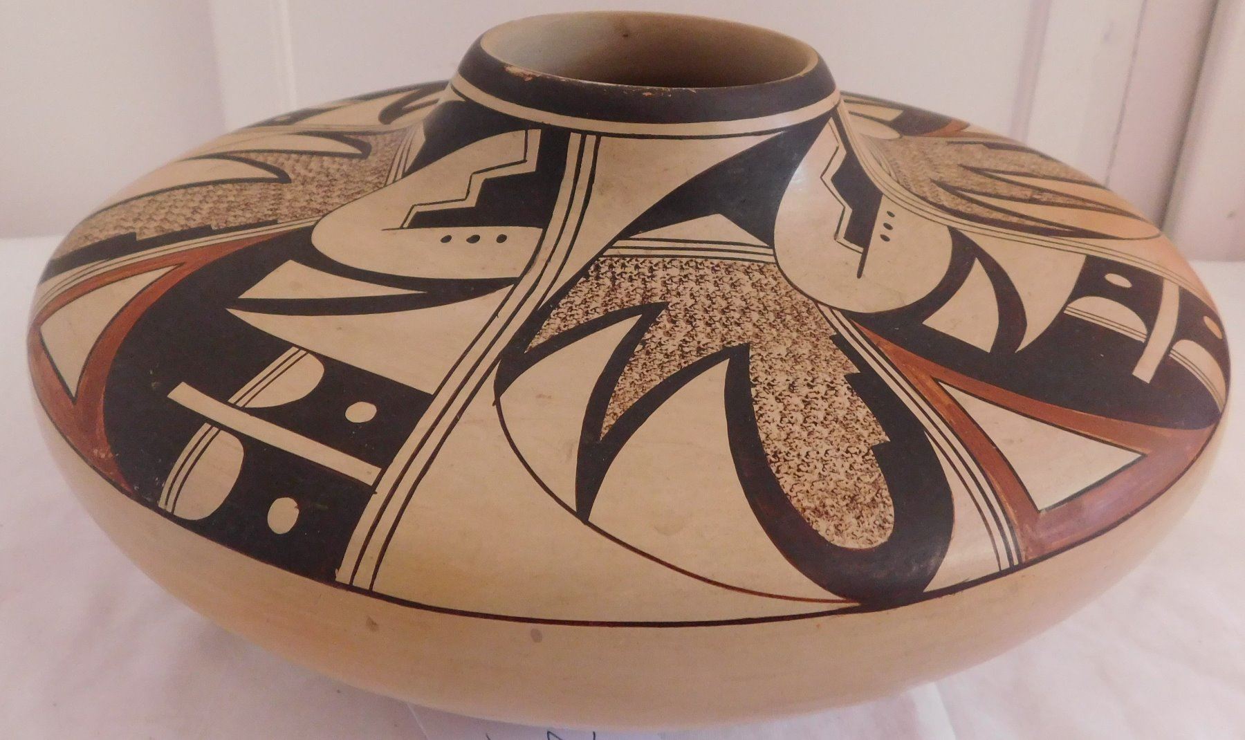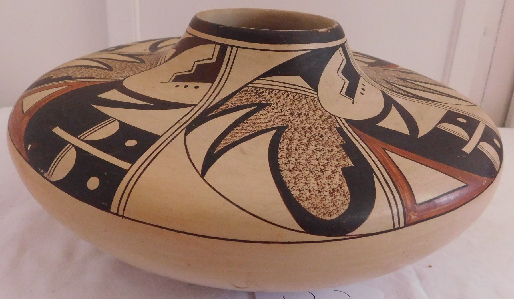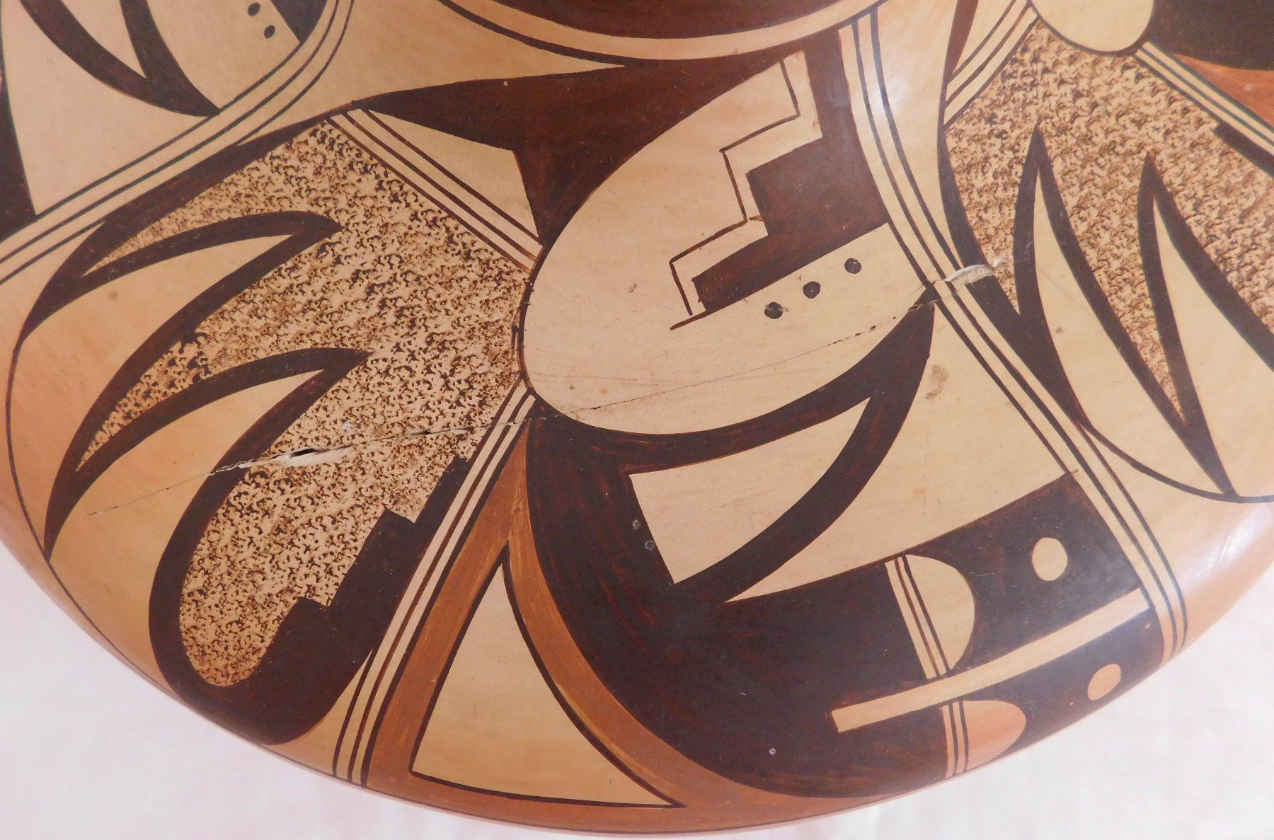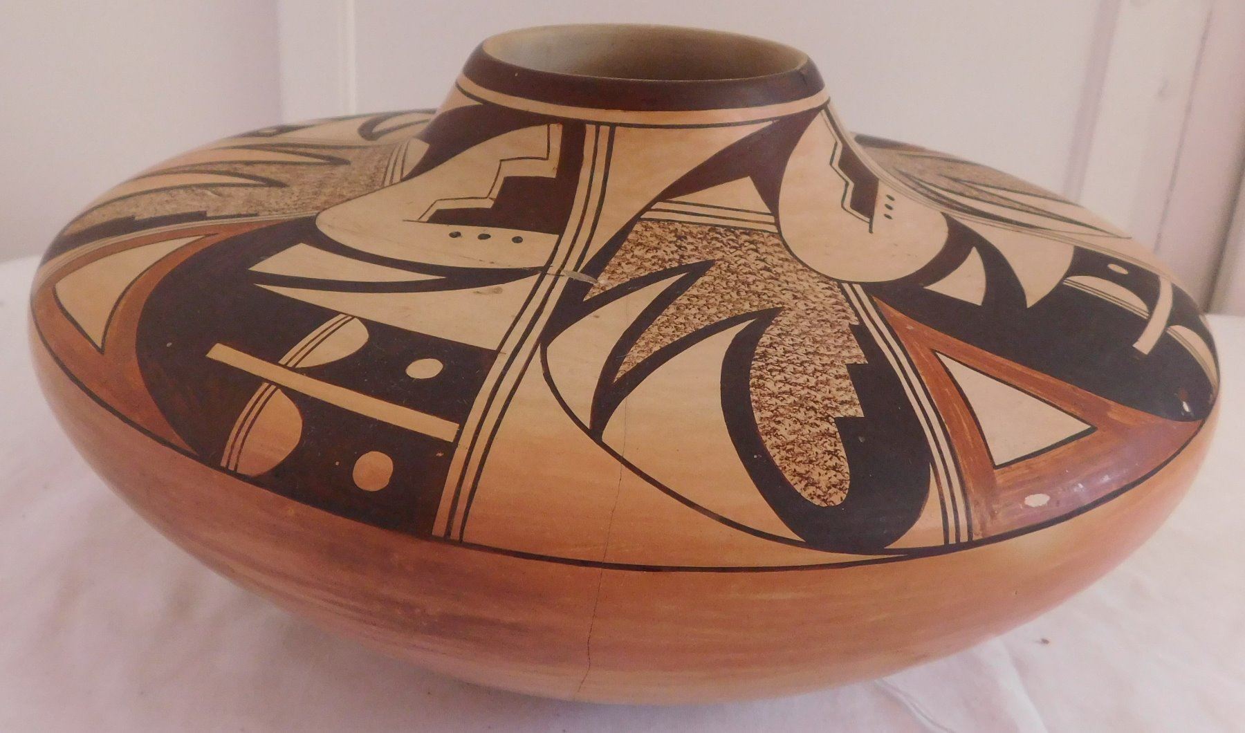 Large Hopi Polychrome Olla, circa 1950s. Made of clay and paint, the items measure 11" x 11" x 5.75". Hopi, signed Little Fawn. Condition: Major crack and repair, see images. Shipping: $40.00 w/insurance and signature.