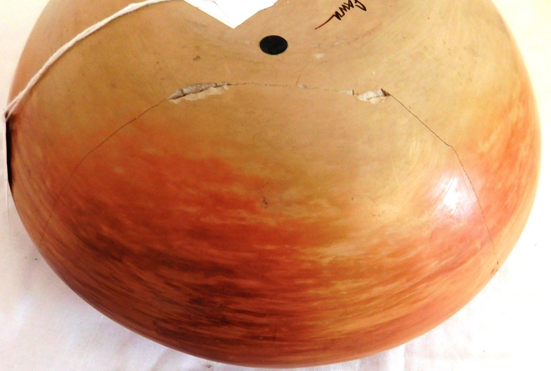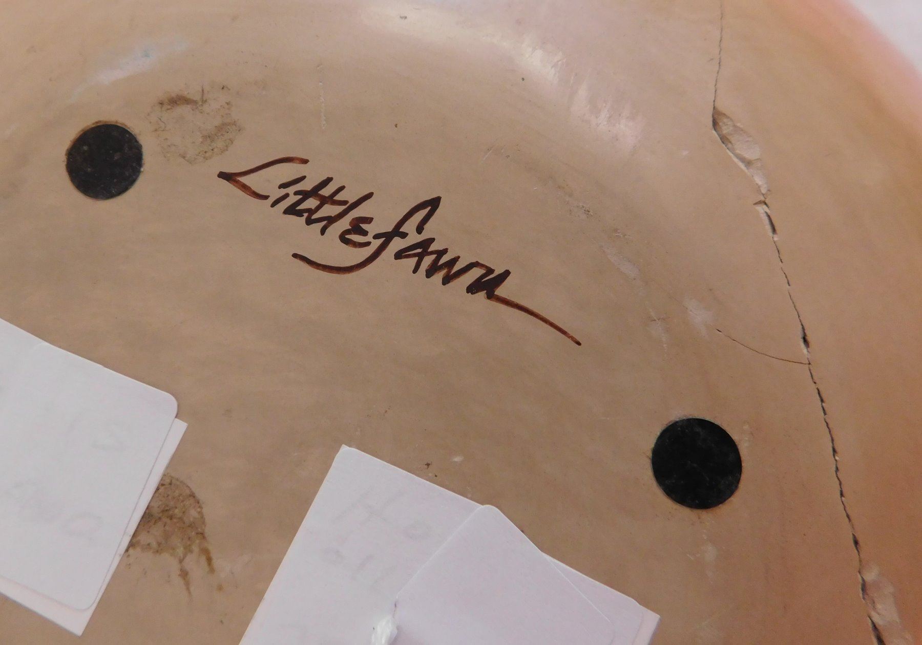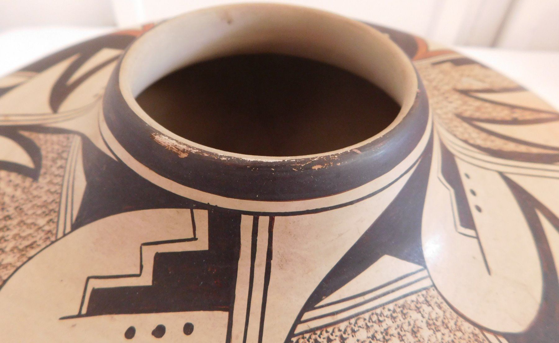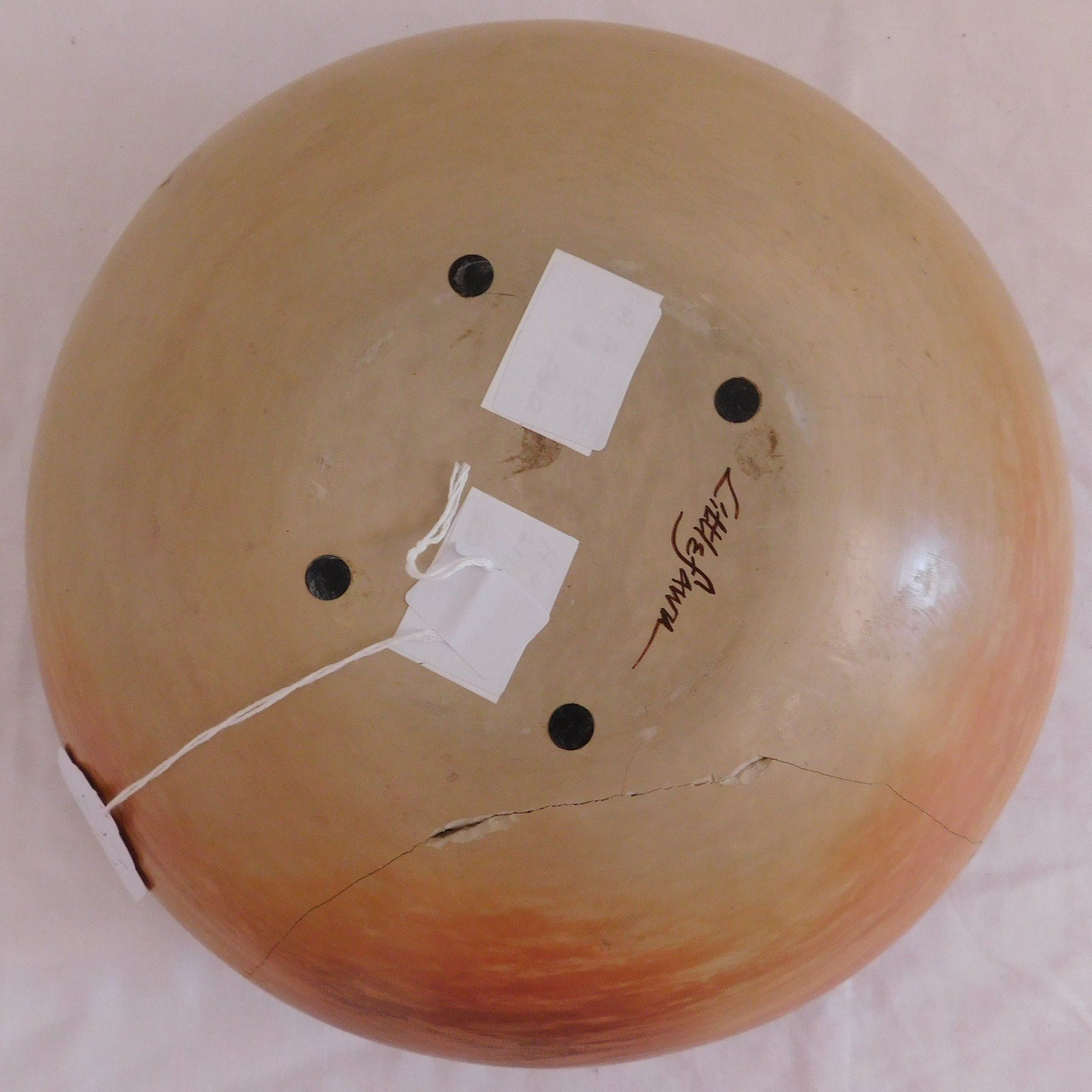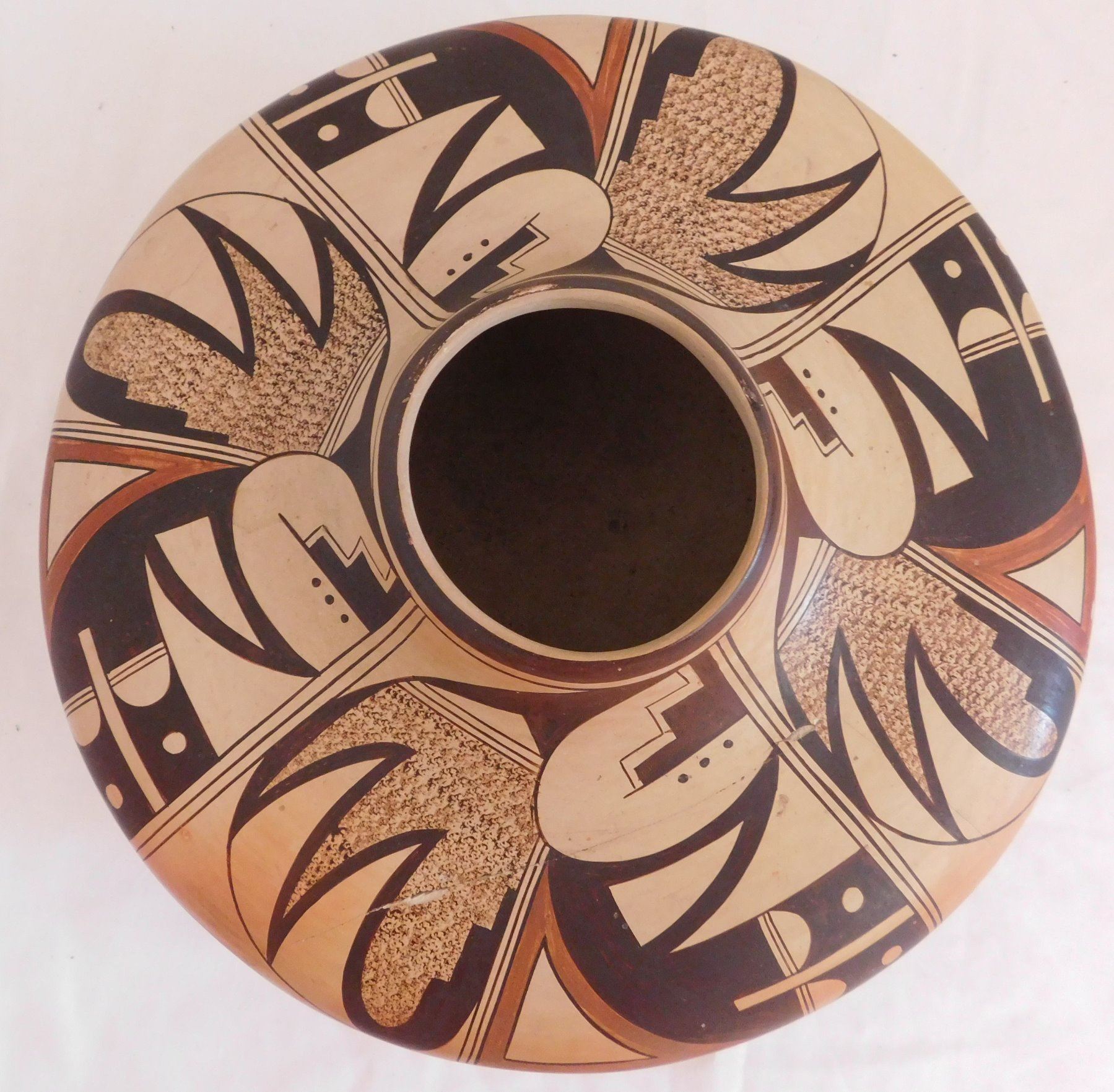 Large Hopi Polychrome Olla, circa 1950s. Made of clay and paint, the items measure 11" x 11" x 5.75". Hopi, signed Little Fawn. Condition: Major crack and repair, see images. Shipping: $40.00 w/insurance and signature.