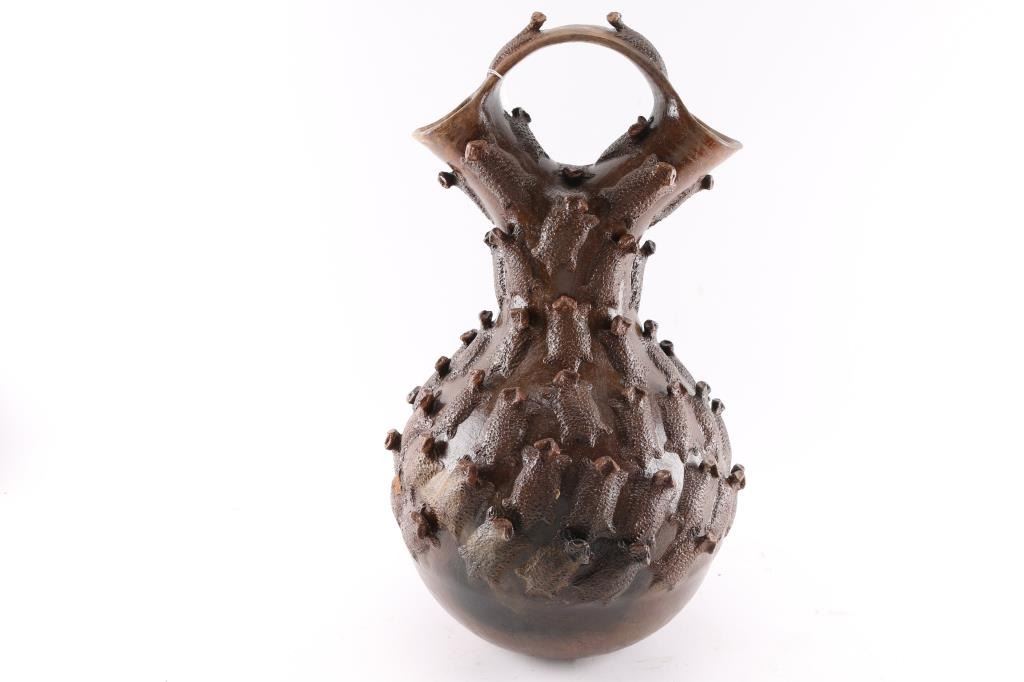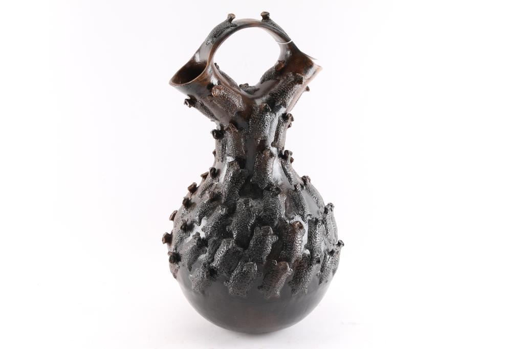 Brown finish with a toad motif, measures 23"x16". In good condition, one small loss to a horny head. Otherwise perfect condition.