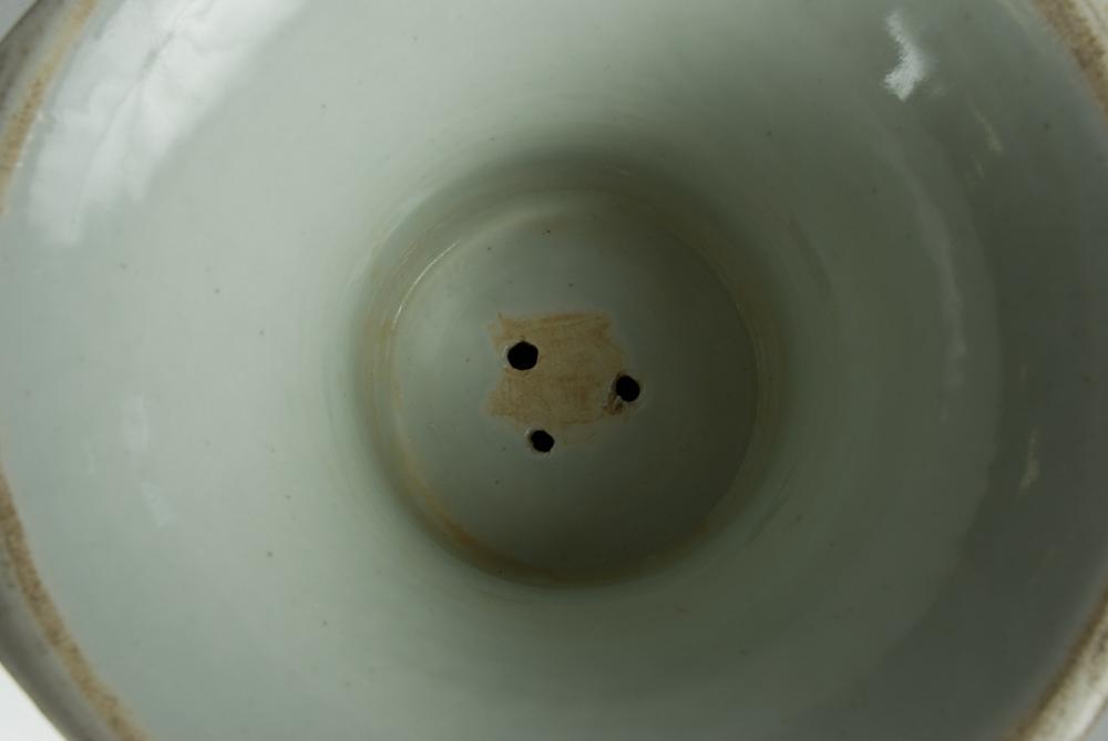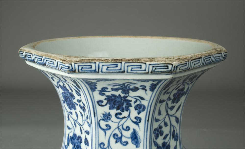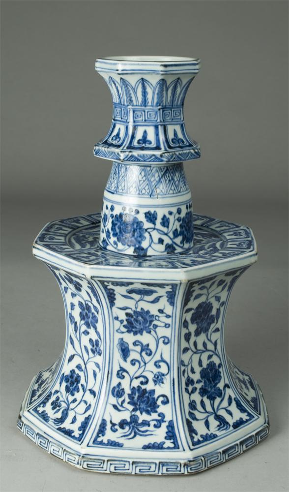 Eight sided base with stepped panels, decorated with lotus, peony and other floral designs and Greek key border on bottom edge. Eight sided stepped column decorated with Greek key, feather and other designs. Ming style, probably 19th Century or earlier. 13" H x 9.5" W.