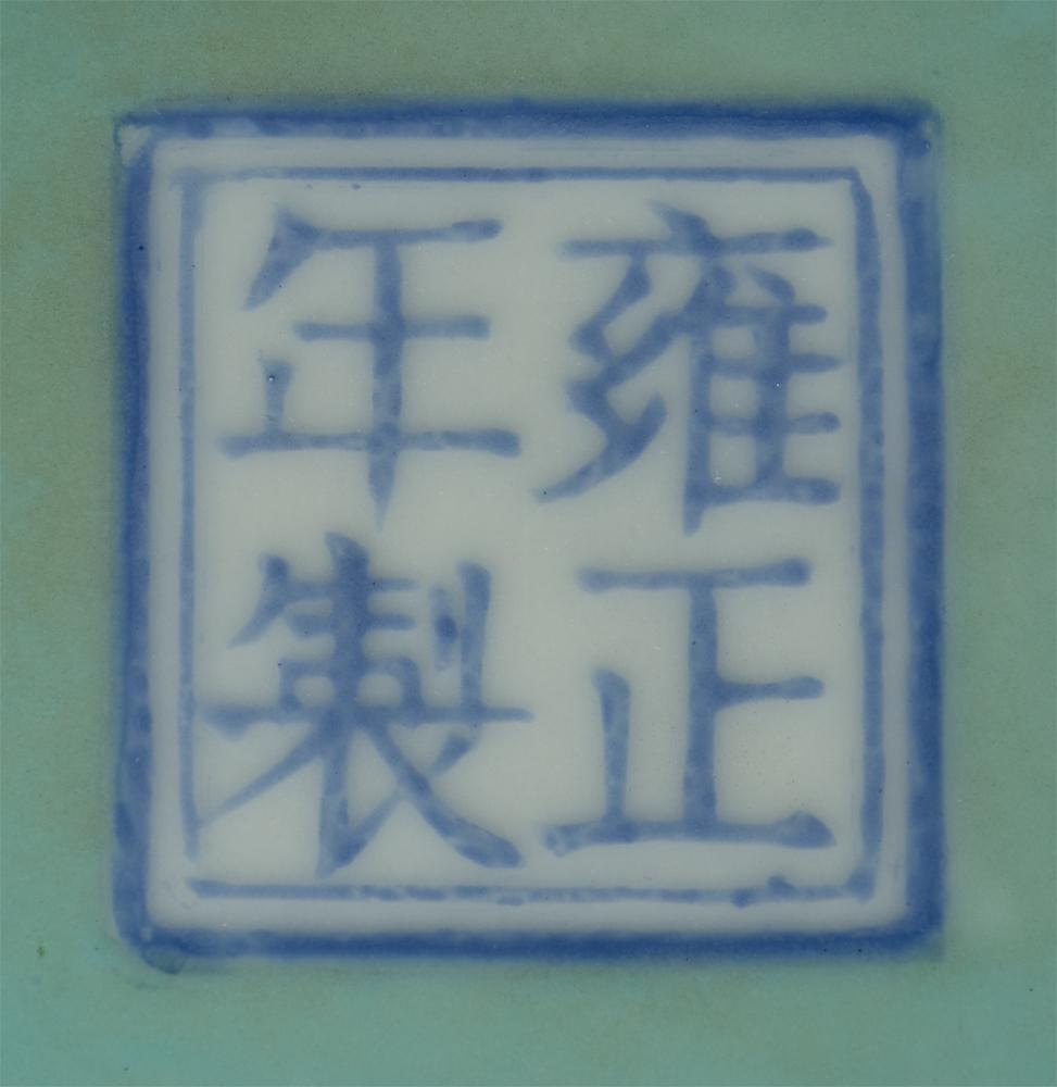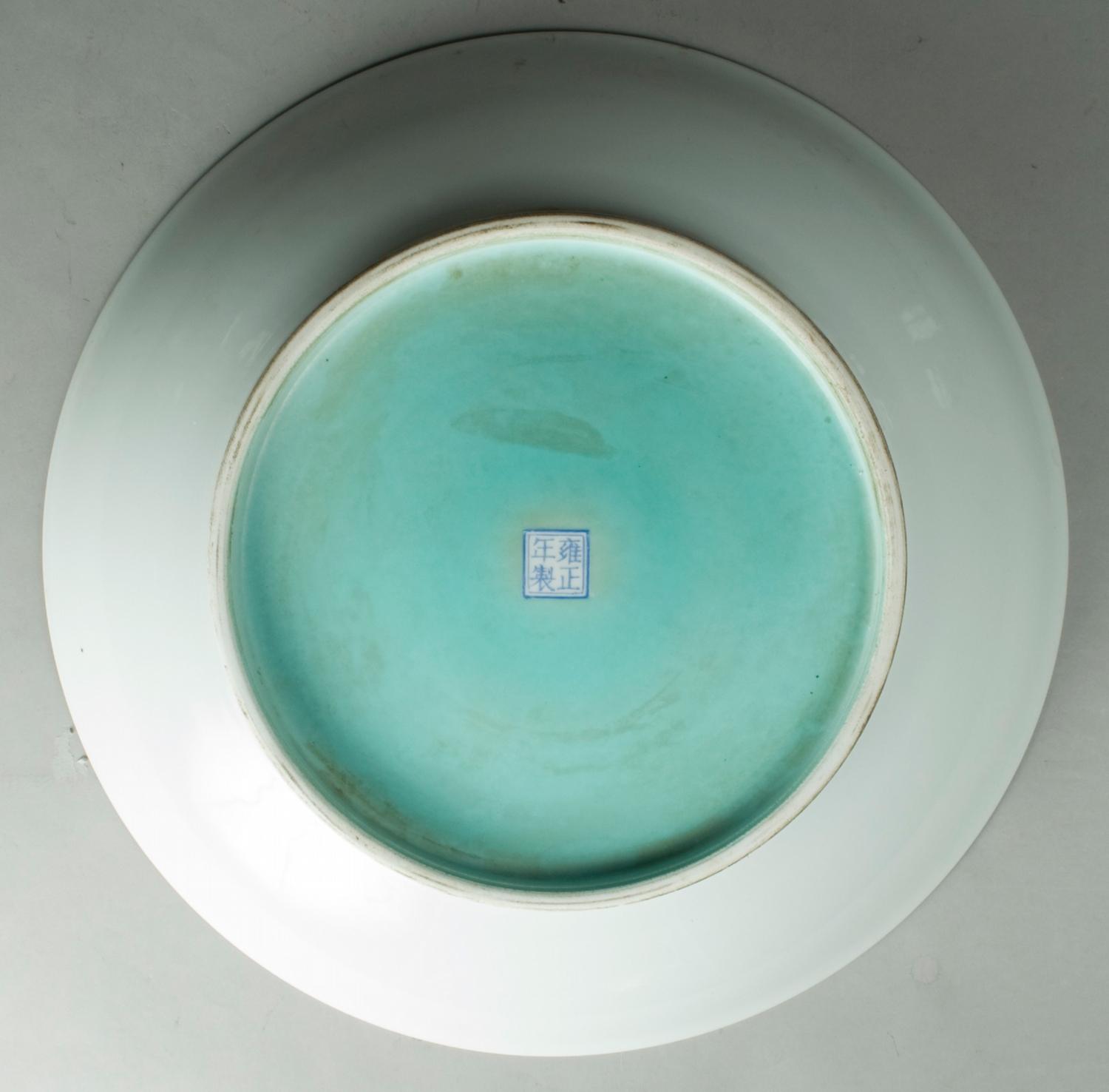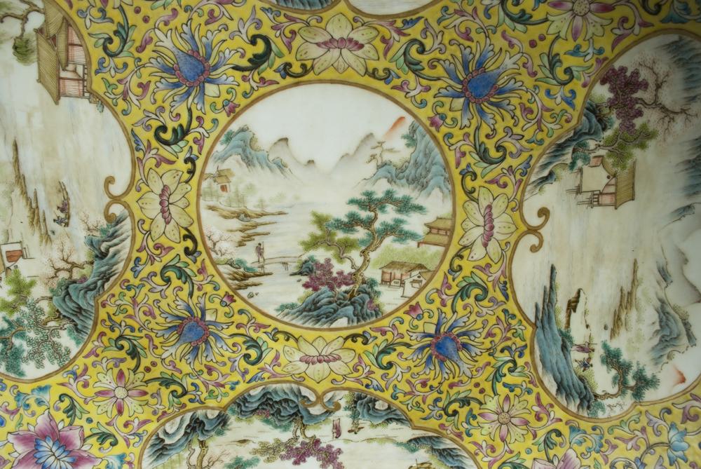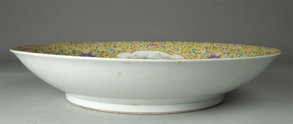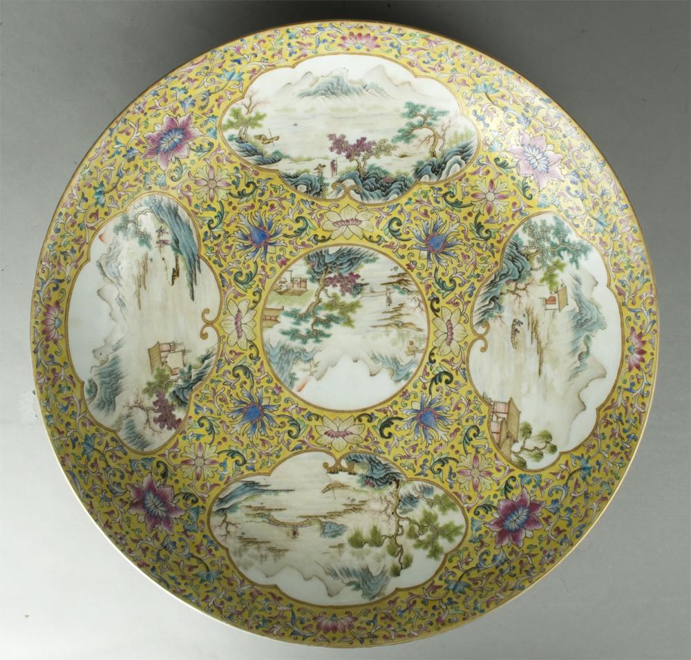 Finely enameled with various floral designs in yellow ground, blues, pinks, turquoise and green. Four cartouches, each depicting different landscape scenes, outlined in gilt, with central circle with landscape scene outlined in gilt. Four character mark for Great Yongzheng production in underglaze blue within two squares. 4" H x 20" Dia. 19th/20th Century.