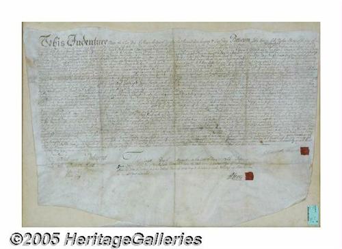 <B>Large, Impressive Framed 1764 Indenture on Vellum</B></I> Convoluted and wordy text accomplishing an Eastern Pennsylvania land transfer. Excellent condition in an attractive form, with red wax seals and flourishes. 25 1/2" x 17", 33" x 24" as nicely framed. Lots of "period" decorative appeal. Lot:251