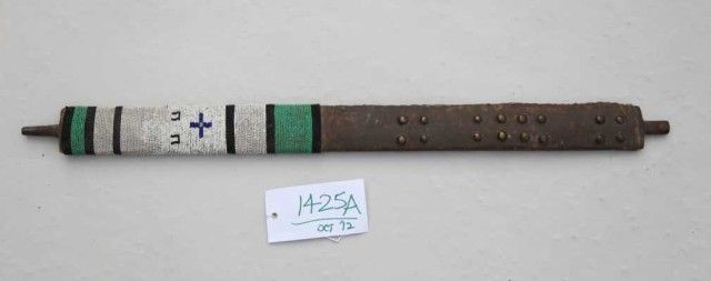 Large Indian hide wrapped wood pipe stem approx. 26” overall and approx. 2” wide with old brass tacks decorating one side and beaded panel on all sides that extend approx. 10” from one end of the stem in black,white, green and blue seed beads; the piece shows age and considerable patina to the brass tacks, hide cover and beadwork. Est.: $500-$1,000.