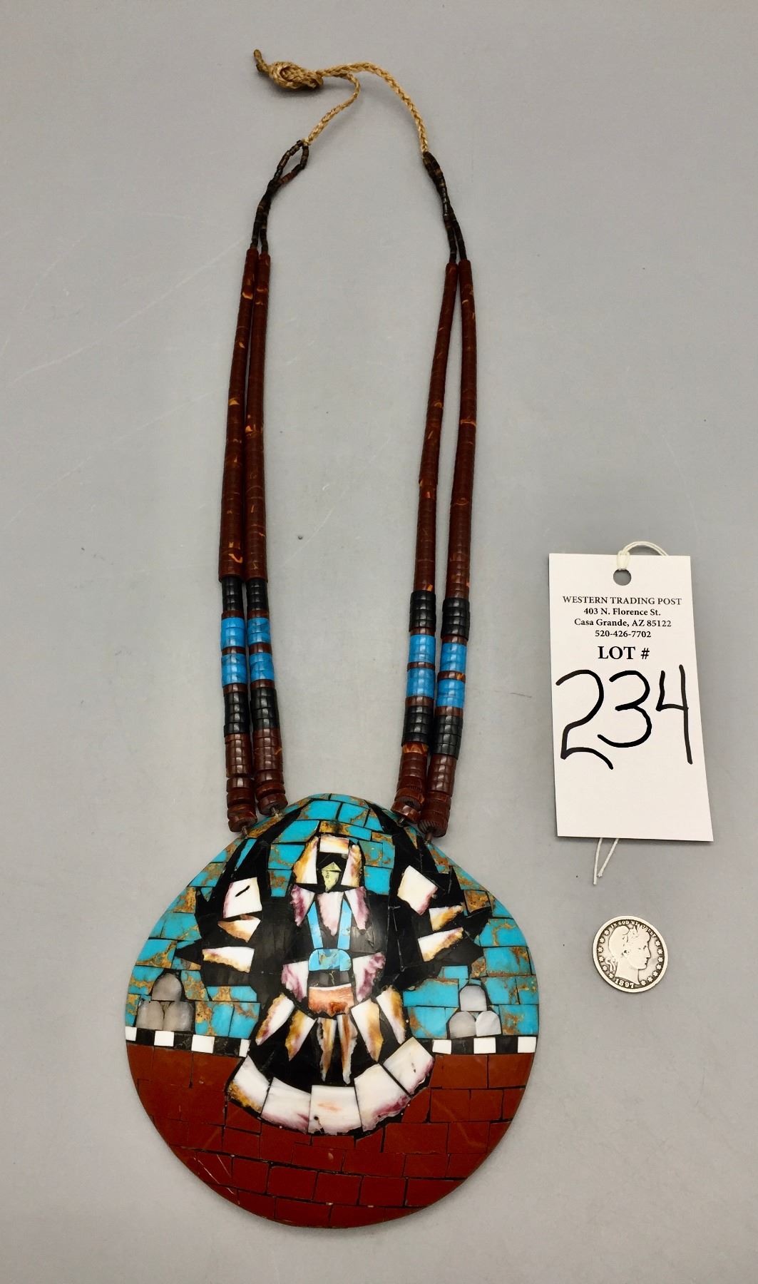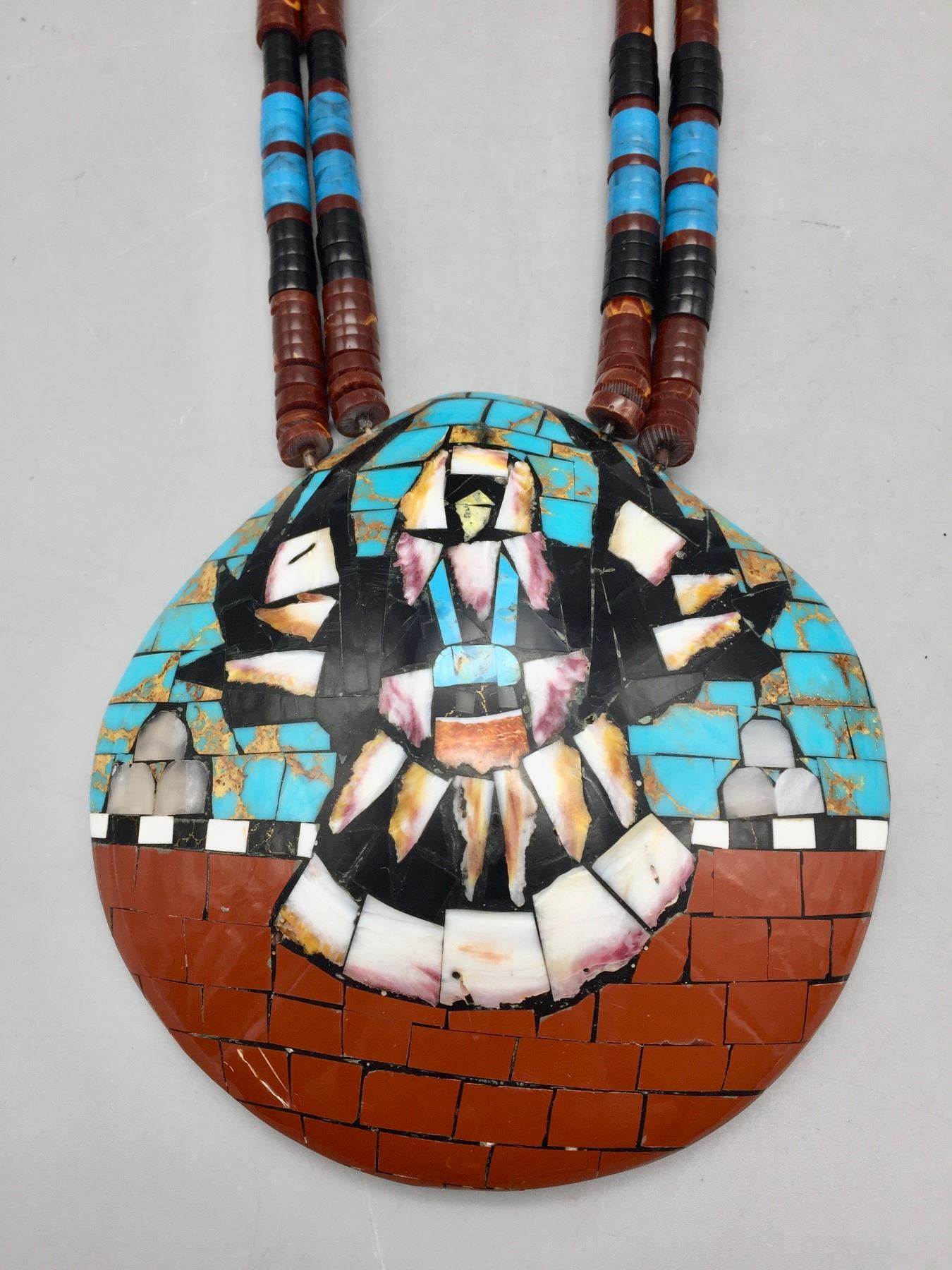 Description: For your bidding enjoyment we offer this large multi-stone inlay shell necklace featuring intricate designs. Maker: Unmarked, but Santo Domingo style. Approx. Age: Fairly modern. Size: Fits a 24-1/2” neck. Pendant measures 5-1/4”w x 5” long. Weighs approximately 207 grams. Condition: Good for its age, normal wear expected. Please look closely at the pictures - they are an important part of our description. Shipping: There will be a $5 handling / packaging fee for shipping this lot. The actual cost of postage will be added on top of that.