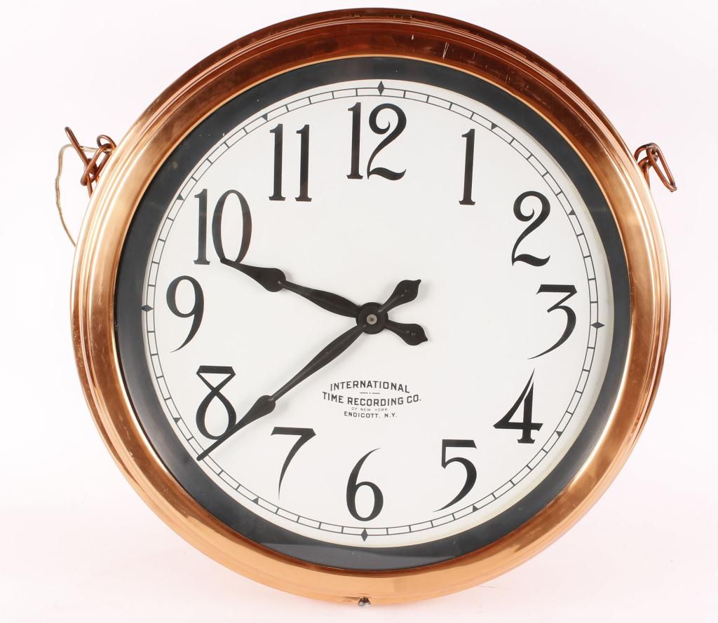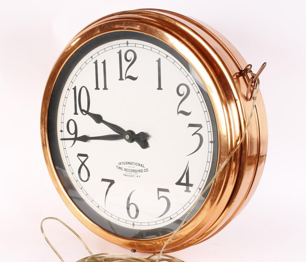 New York, beautifully cased in copper which has been restored, type used by train stations, measures 21" diameter.