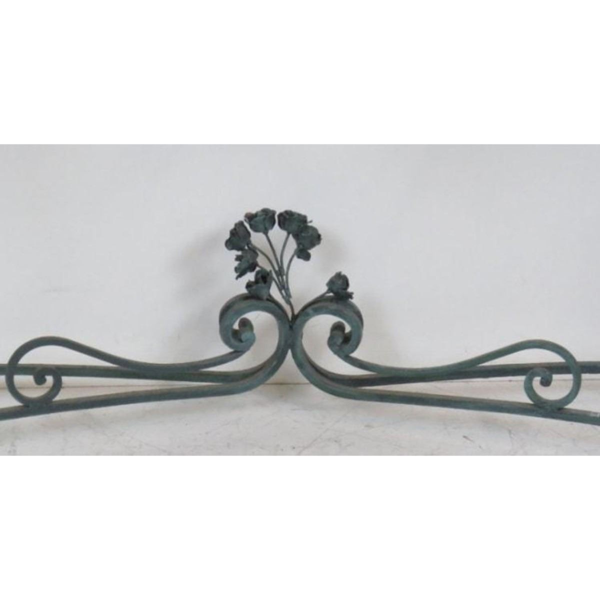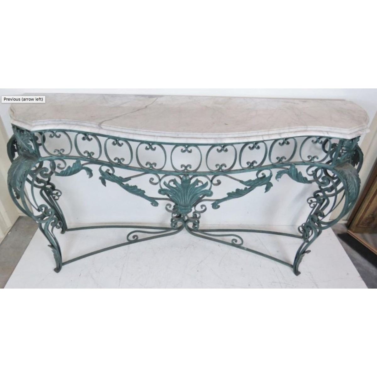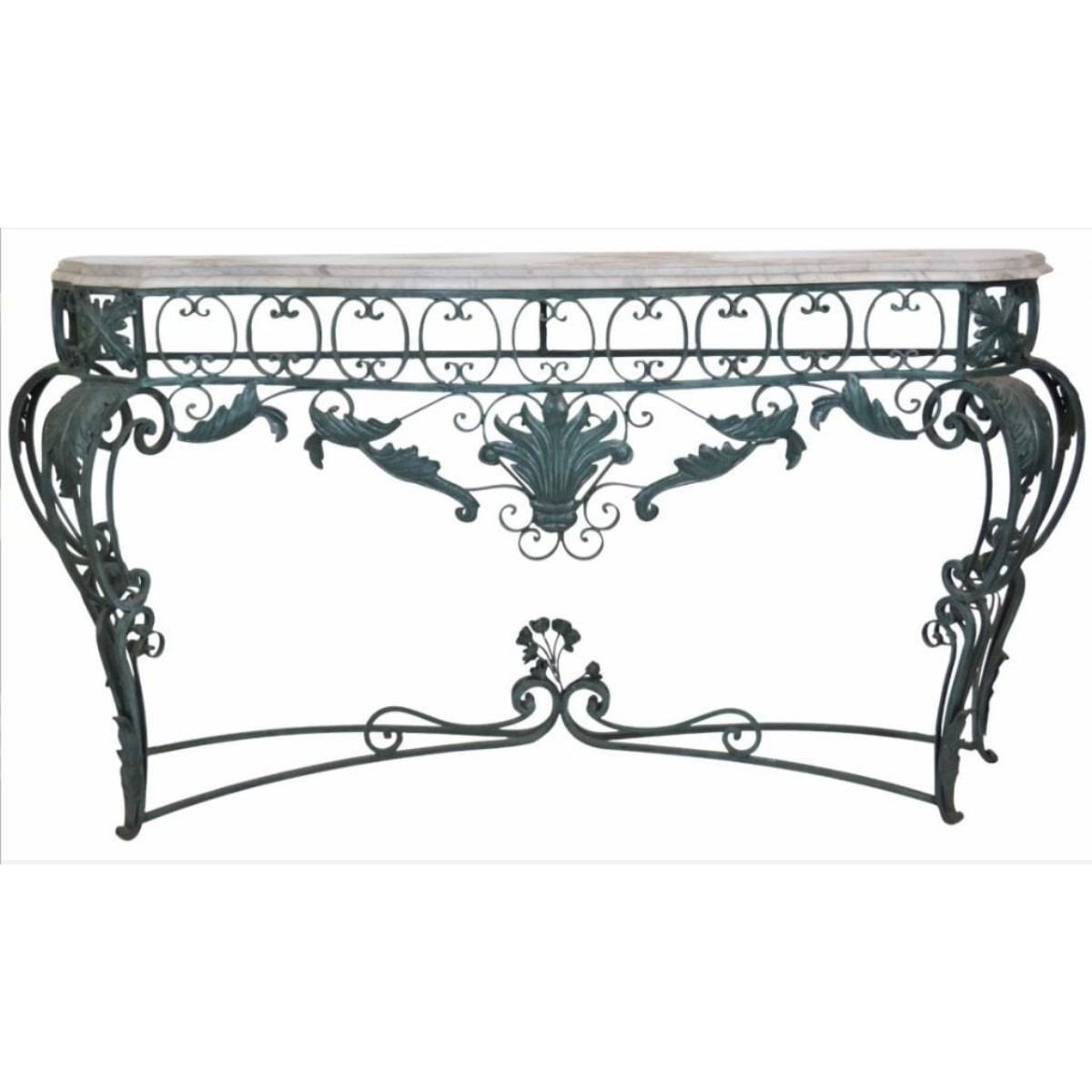 Large, Italian-style console. Verdigris painted iron base with marble top. 45" H X 82" W X 20 1/2"D.