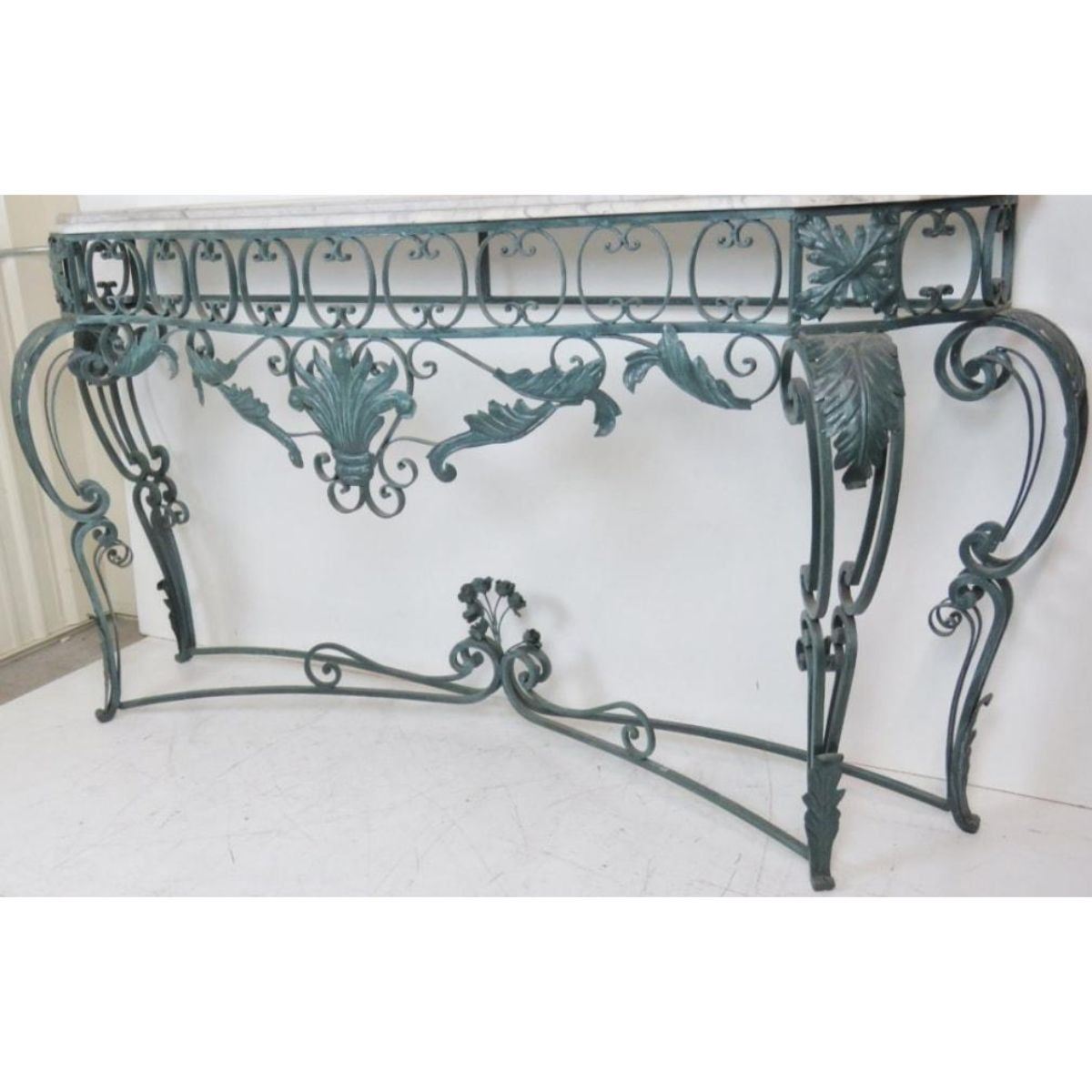 Large, Italian-style console. Verdigris painted iron base with marble top. 45" H X 82" W X 20 1/2"D.