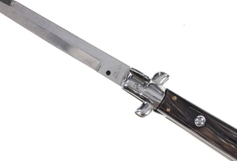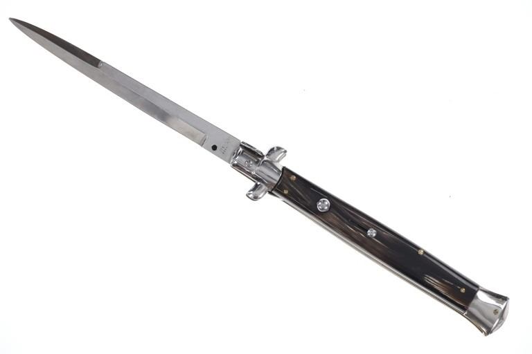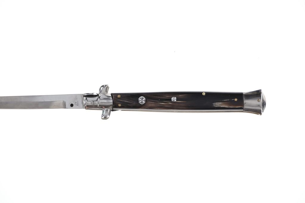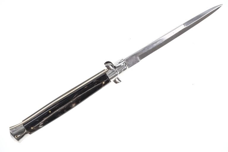 Featured in this lot is this large, Italian Stiletto switchblade knife from the late 20th century. The knife displays a single edged blade, with a multicolored resin handle, a steel bolster and action button. The blade is marked but is illegible. The knife shows a traditional action with a button which when pressed, releases the blade immediately thrusting it forward and then locking into active position. The knife shows a strong action and good functionality. It shows good condition overall with no wear or damage present. The knife measures 13 1/8" long with the blade measuring 6" long. When closed, the knife measures 7 1/4" L x 1 3/8" W. It has a total weight of 183.7 grams.