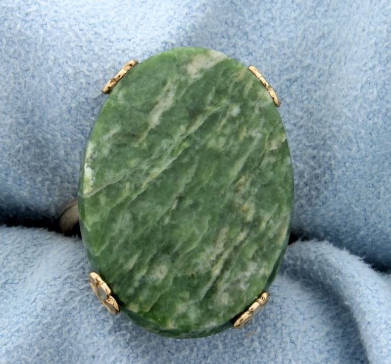 In 10K yellow gold, the jade has beautiful light and dark greens throughout gemstone. Size 7 1/4 5.4g