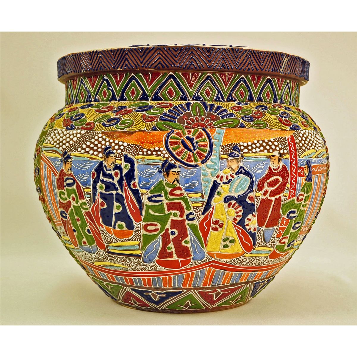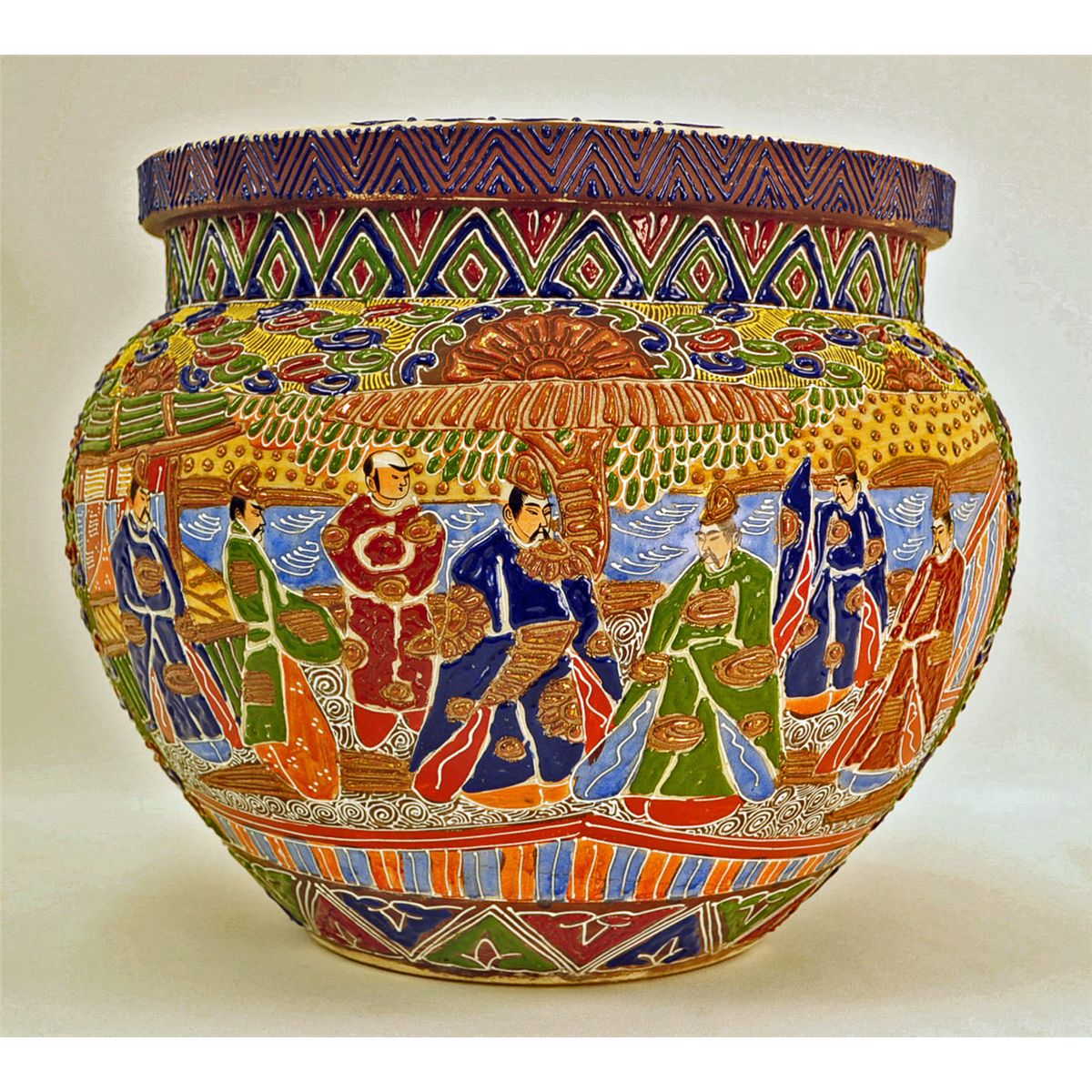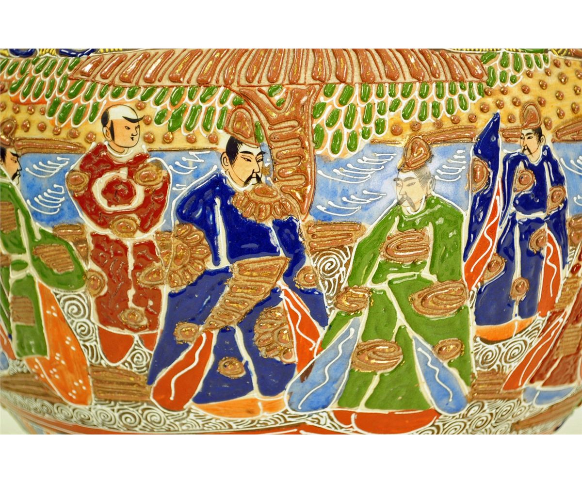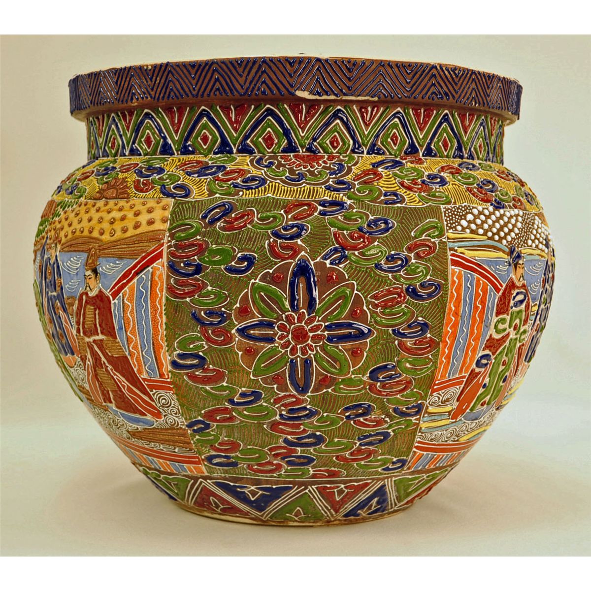 Large Japanese Moriage Satsuma hand painted Jardinière. 11.5" H. X 14.5" Dia.;Vessel has an approx. 8" horizontal crack in lower section just above base. Crack is visible from interior and slightly noticeable from interior.