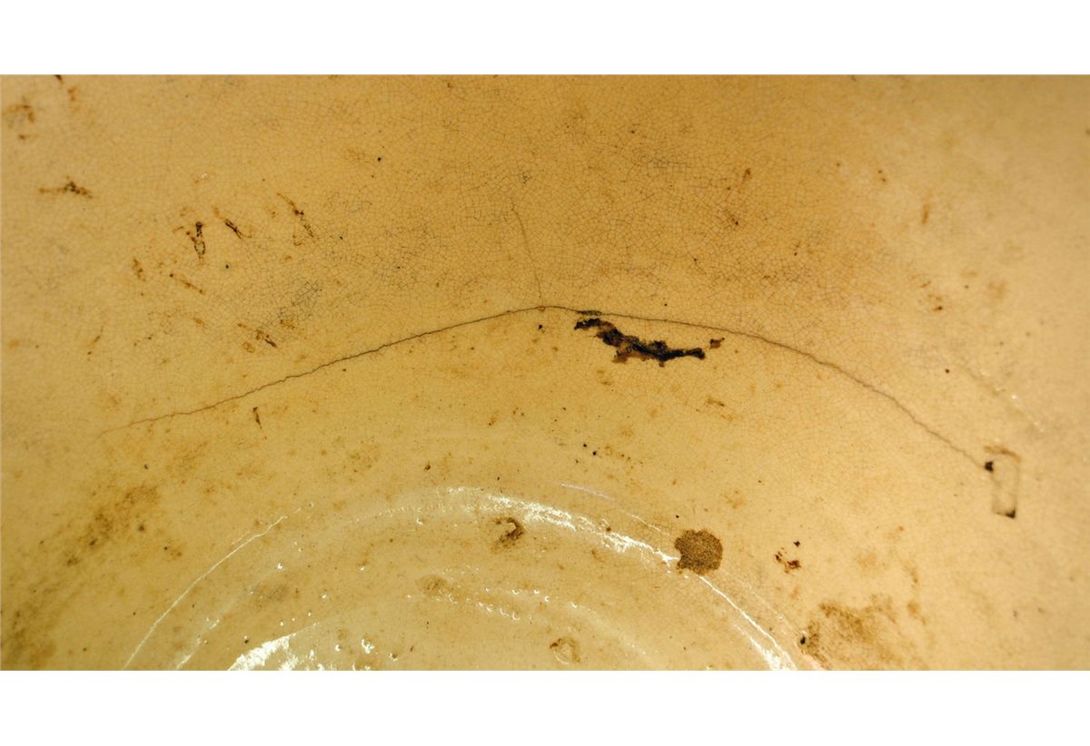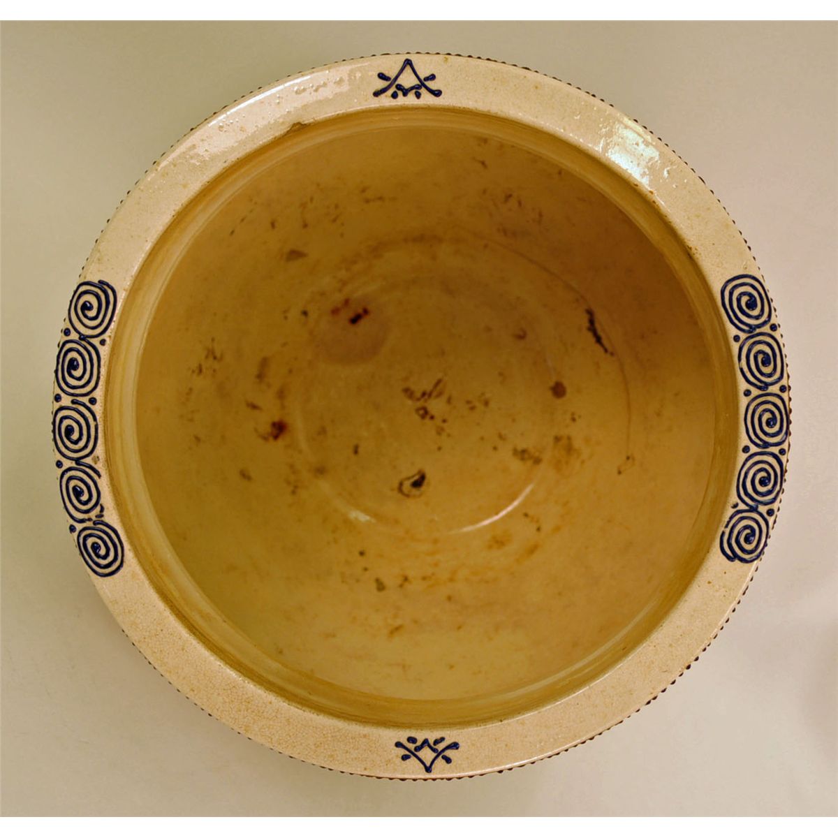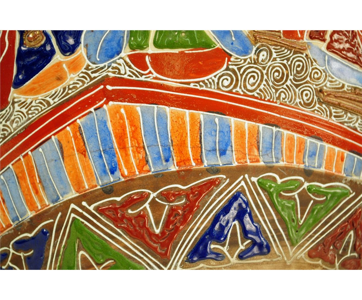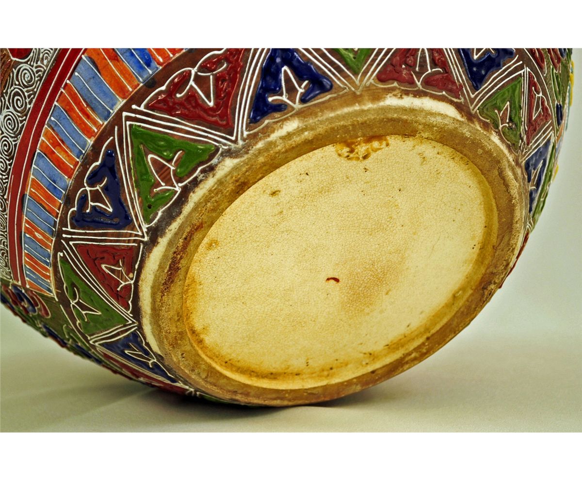 Large Japanese Moriage Satsuma hand painted Jardinière. 11.5" H. X 14.5" Dia.;Vessel has an approx. 8" horizontal crack in lower section just above base. Crack is visible from interior and slightly noticeable from interior.