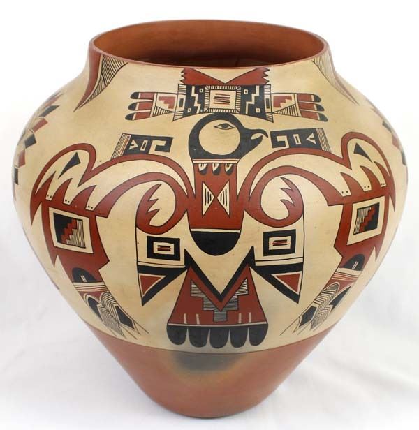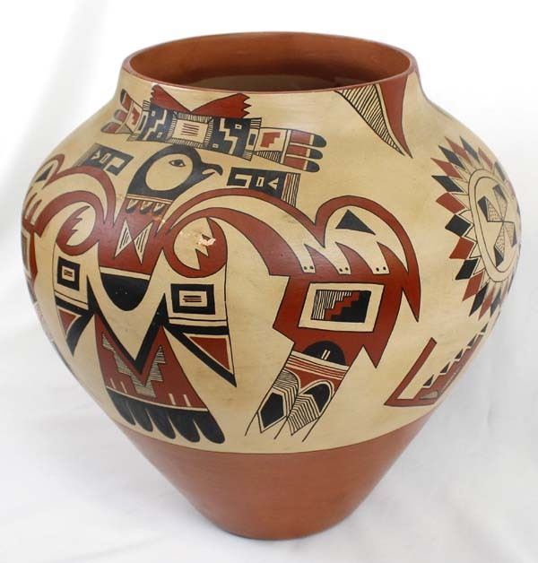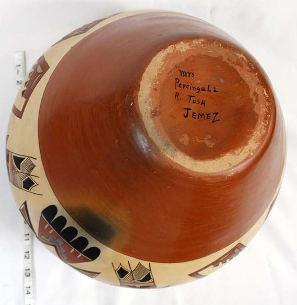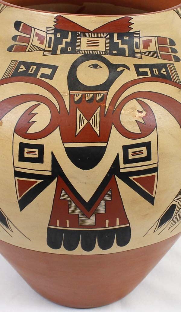 Large Native American Jemez Pottery Olla by Ms. Percingula Romero Tosa (1923-1996), and signed Jemez, measures 14''H x 15''D and is signed on the bottom, beautiful designs, some paint loss to one of the bird's wings, some minor scuffing, no fire clouds, smooth inside Pottery Jar.