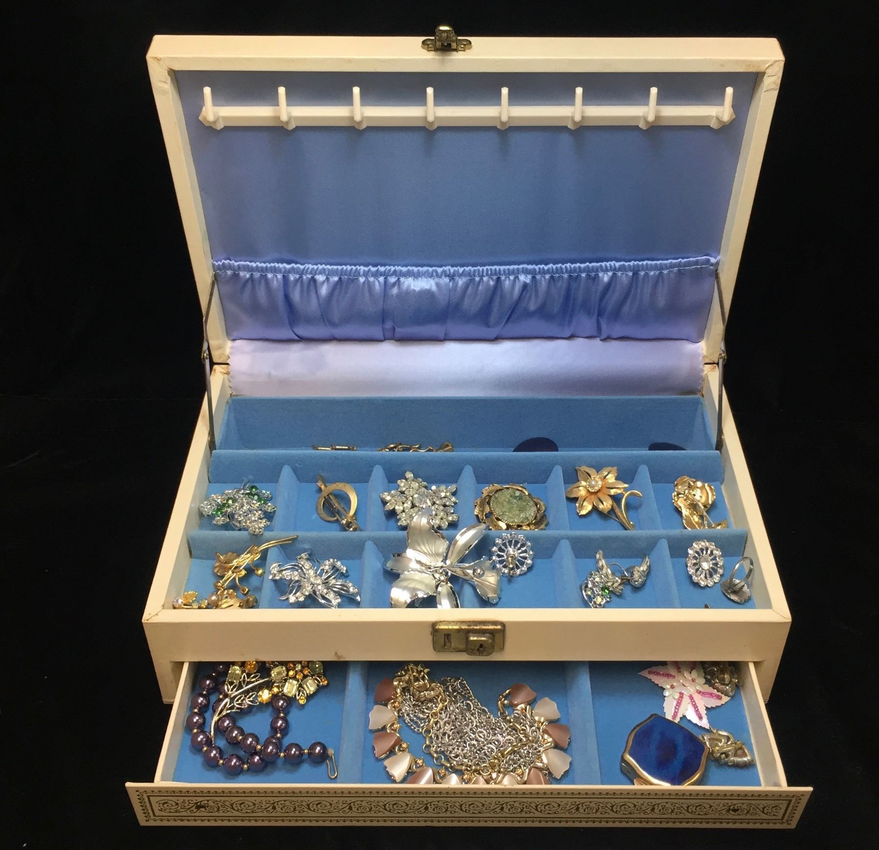 Lot 178; Large Jewellery Box with Items Enclosed, Includes Brochets, Necklaces, Stratton Made in England Petit Case, Earings