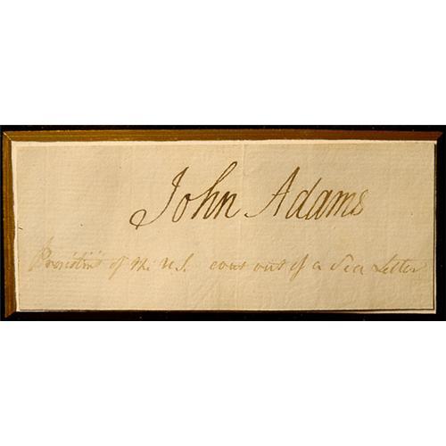 <Our item number 135736><B>Adams, John.</B> (1735-1826) 2nd President of the United States (1797-1801). Large signature on a 2 x 5 in. piece of paper with a notation in another hand below, "President of the U.S. cut out of a Sea Letter." Matted with a bust portrait of Adams and framed to an overall size of 14½ x 12¼ in. With a COA from the late autograph dealer Charles Hamilton on the verso. <BR>Estimated Value $1,200 - 1,500. <BR><BR>Our item number 135736<BR><IMAGES><P ALIGN="CENTER"><IMG SRC="http://www.goldbergcoins.net/liveauction/49jpegs/135736.jpg"> </P></IMAGES>